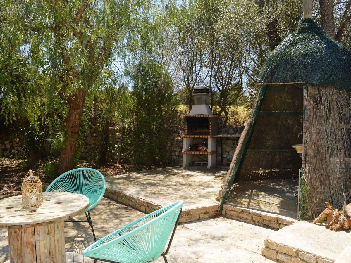 Outdoor terrace with dining room, garden and pool area, barbecue area.