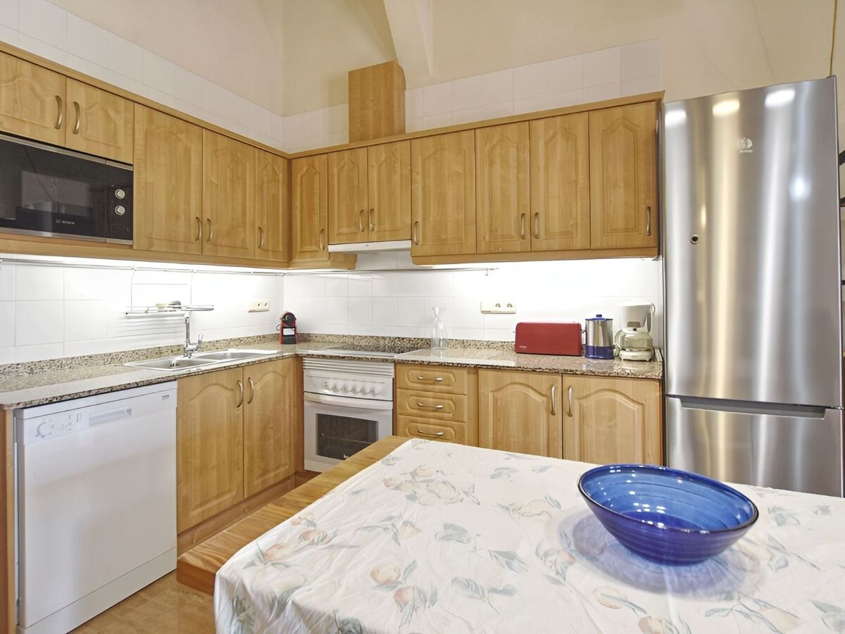 The air-conditioned and fully equipped kitchen is located close to the living room and has access to the covered terrace with a dining table.