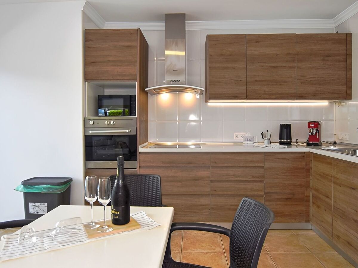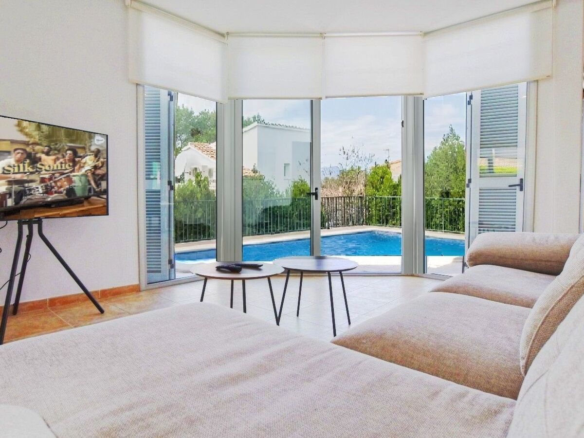 From the entrance, you enter the spacious living-dining room, and to the right is the open plan kitchen, all with a large window overlooking the pool.