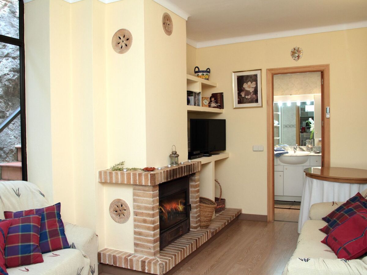 The living room invites you to relax with its cosy fireplace and television, while an additional fan provides comfort on hot days.