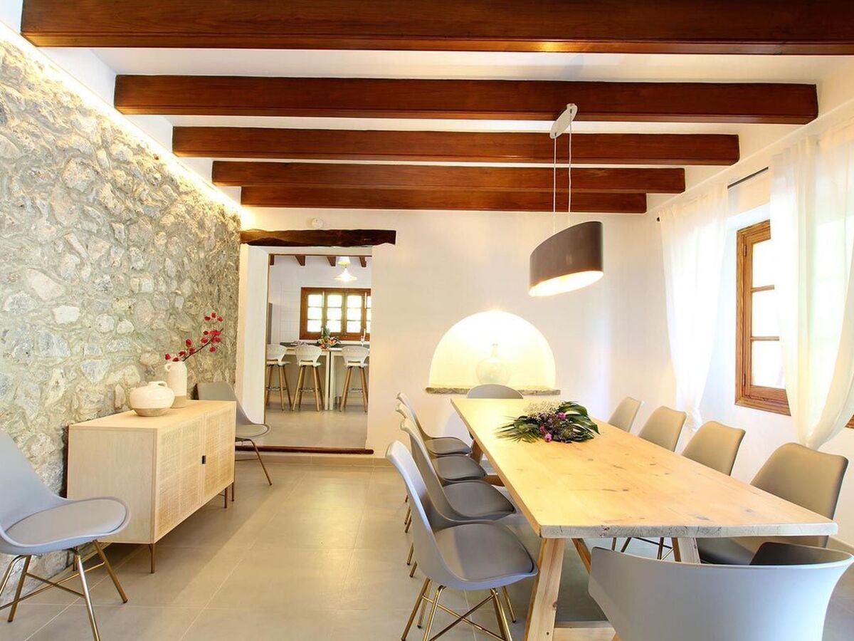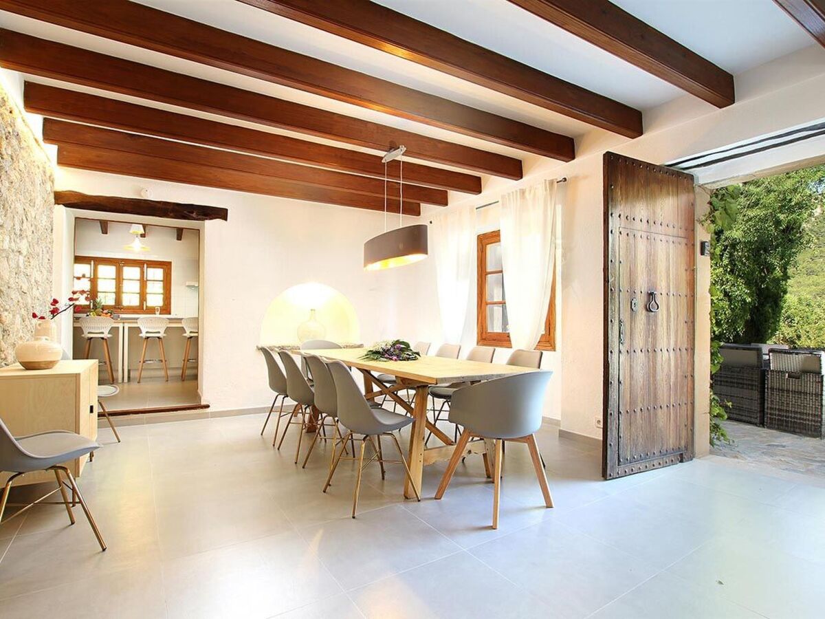 This leads to a large fully equipped kitchen, which still conserves the old fireplace (currently disabled) typical of the old Mallorcan houses.
