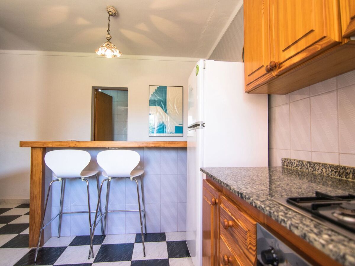 Just to the right is the semi-open kitchen with a breakfast bar, fully equipped with gas hob, electric oven, microwave, dishwasher, fridge, freezer and all the necessary cooking utensils.