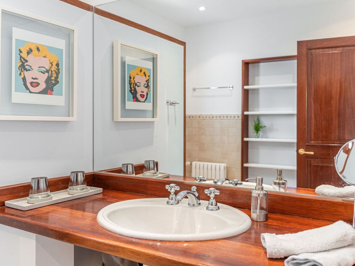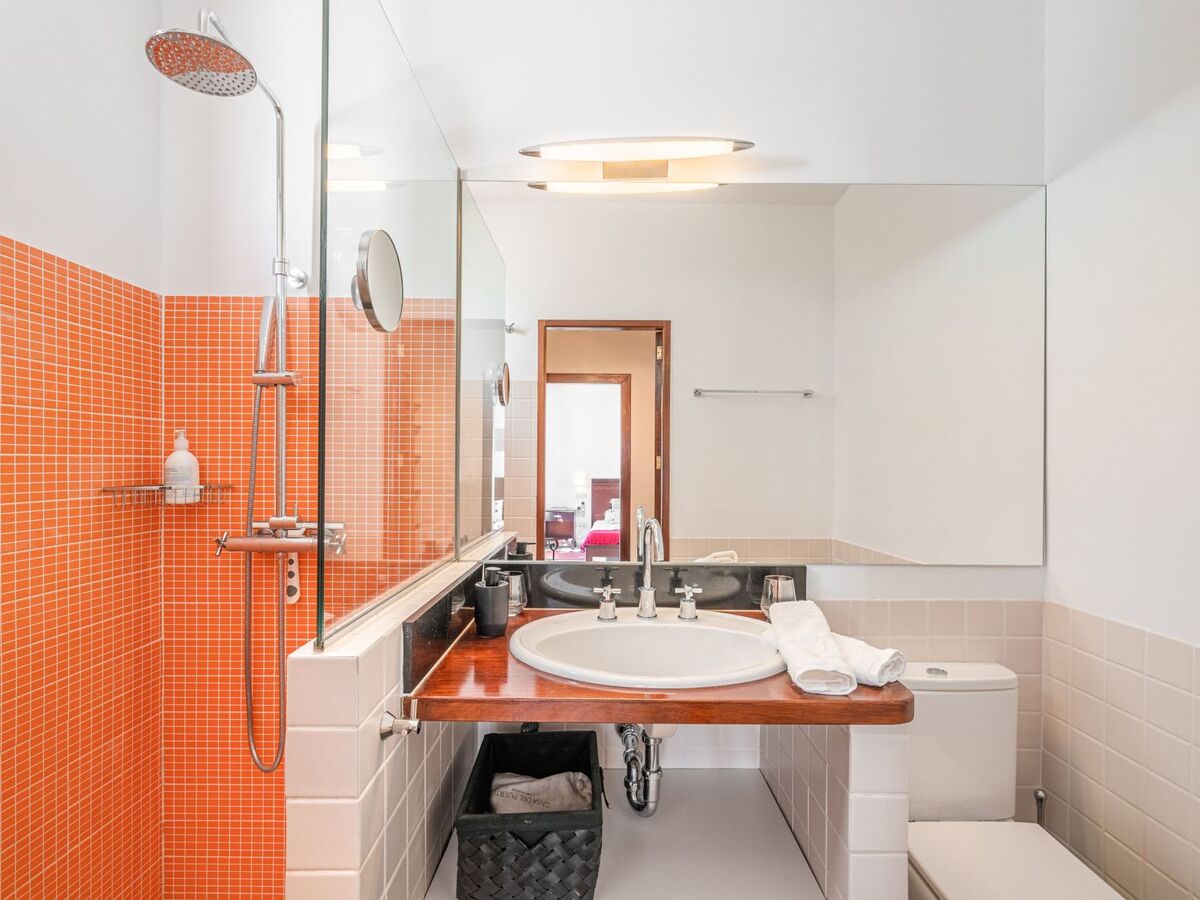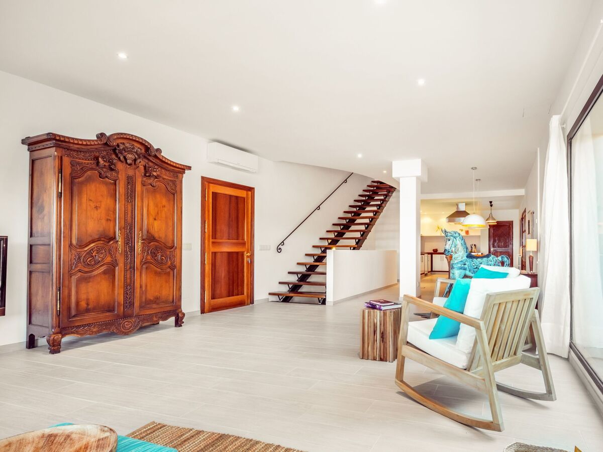 150 sqm terrace on 2 floors, 3 bedrooms (with air conditioning), 3 bathrooms (1 en suite), spacious living and dining area, open-plan kitchen with large cooking island (SMEG, gas), fridge/freezer (Bosch), dishwasher, tumble dryer and washing machine (Miele), separate storage room.