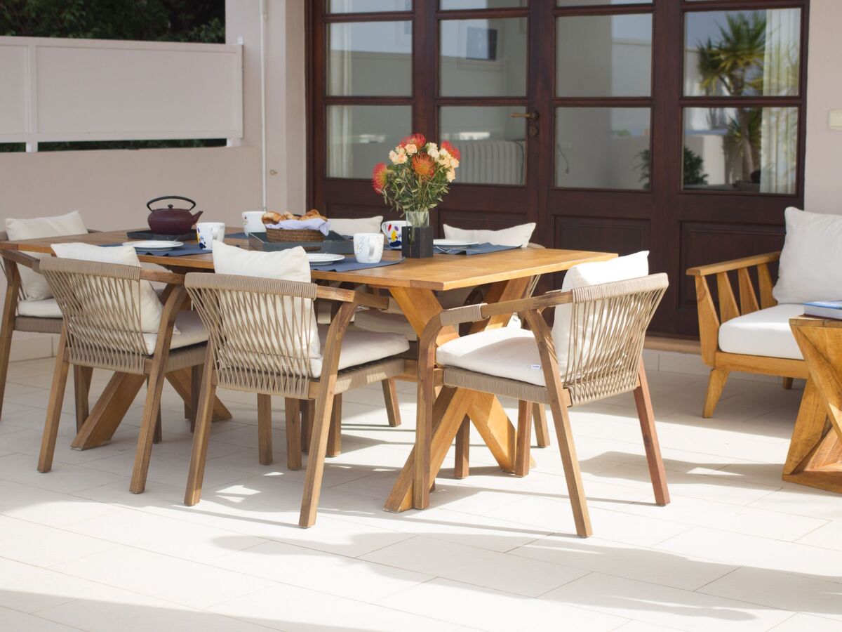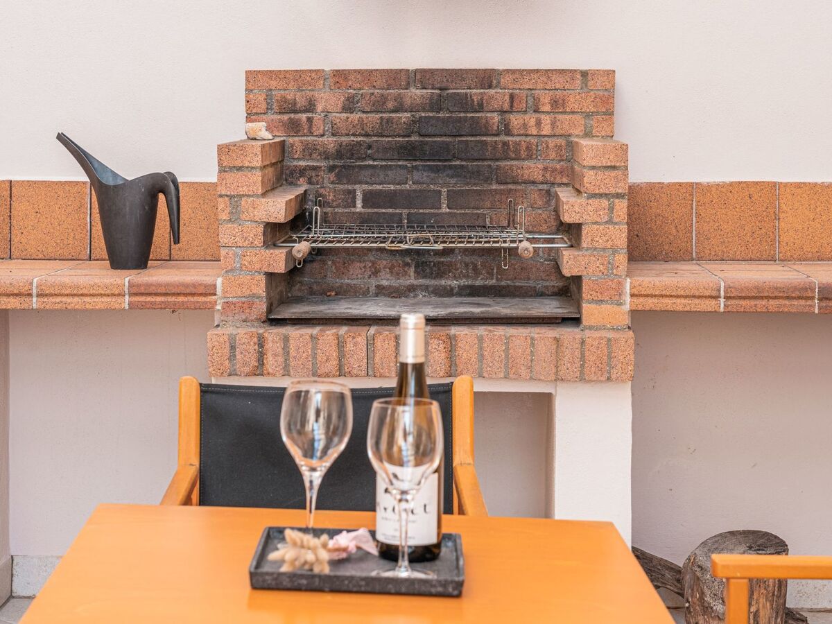 Additional shaded dining area in front of the charcoal barbecue for four people.