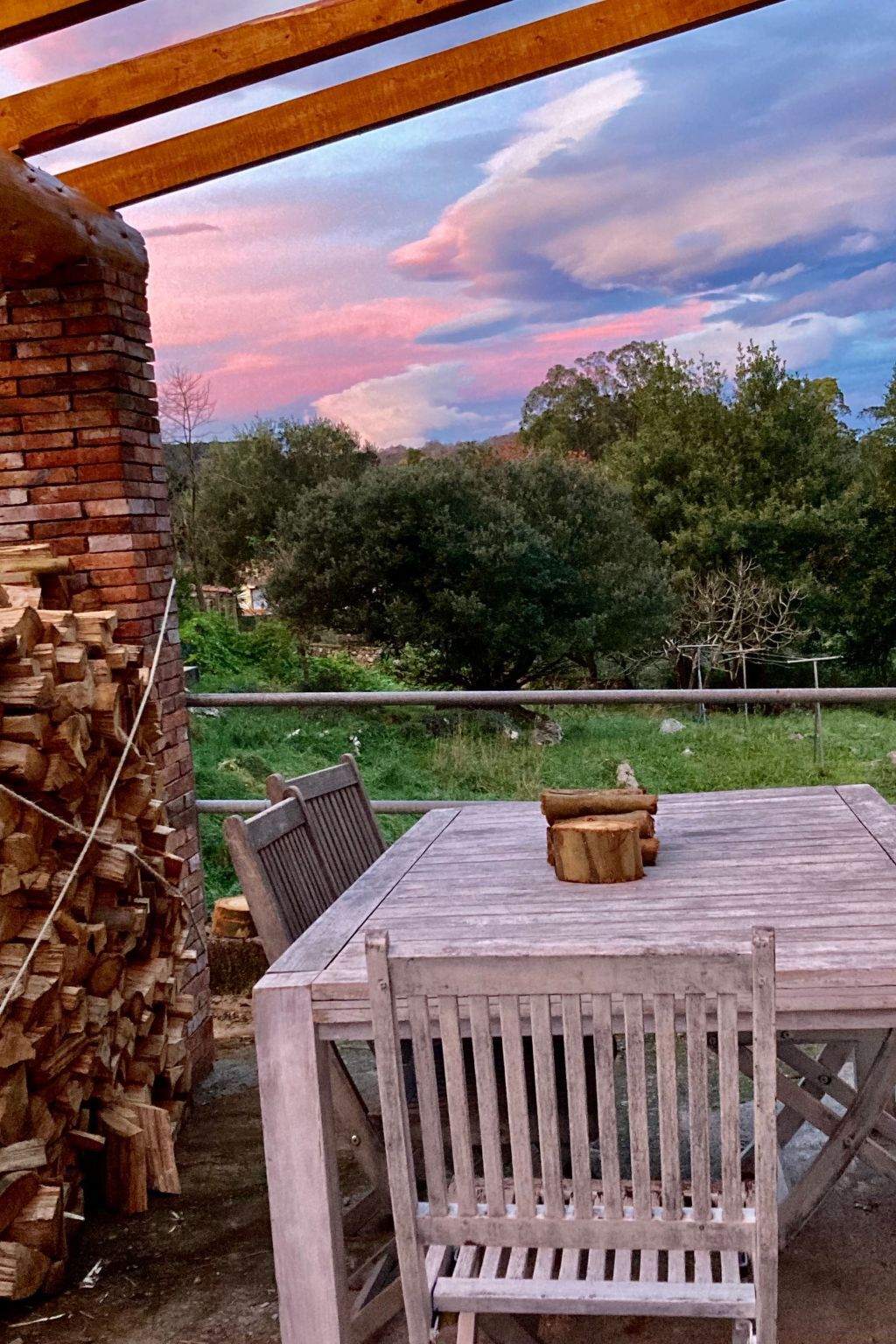 View of the forest to the west.One space for a car.1 double bedroom faces East, and one double bedroom faces west.Sitting room has two sofas, a keyboard ,TV, klappa wooden and boardgames.