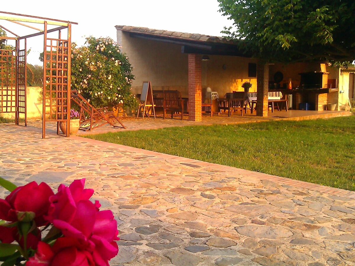 The outdoor area offers a private garden that invites you to enjoy the open air with its table and chairs for dining, barbecue, and a swimming pool surrounded by sun loungers.