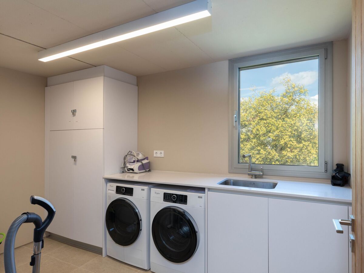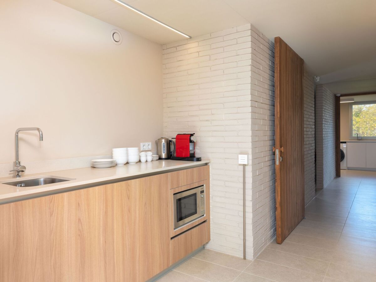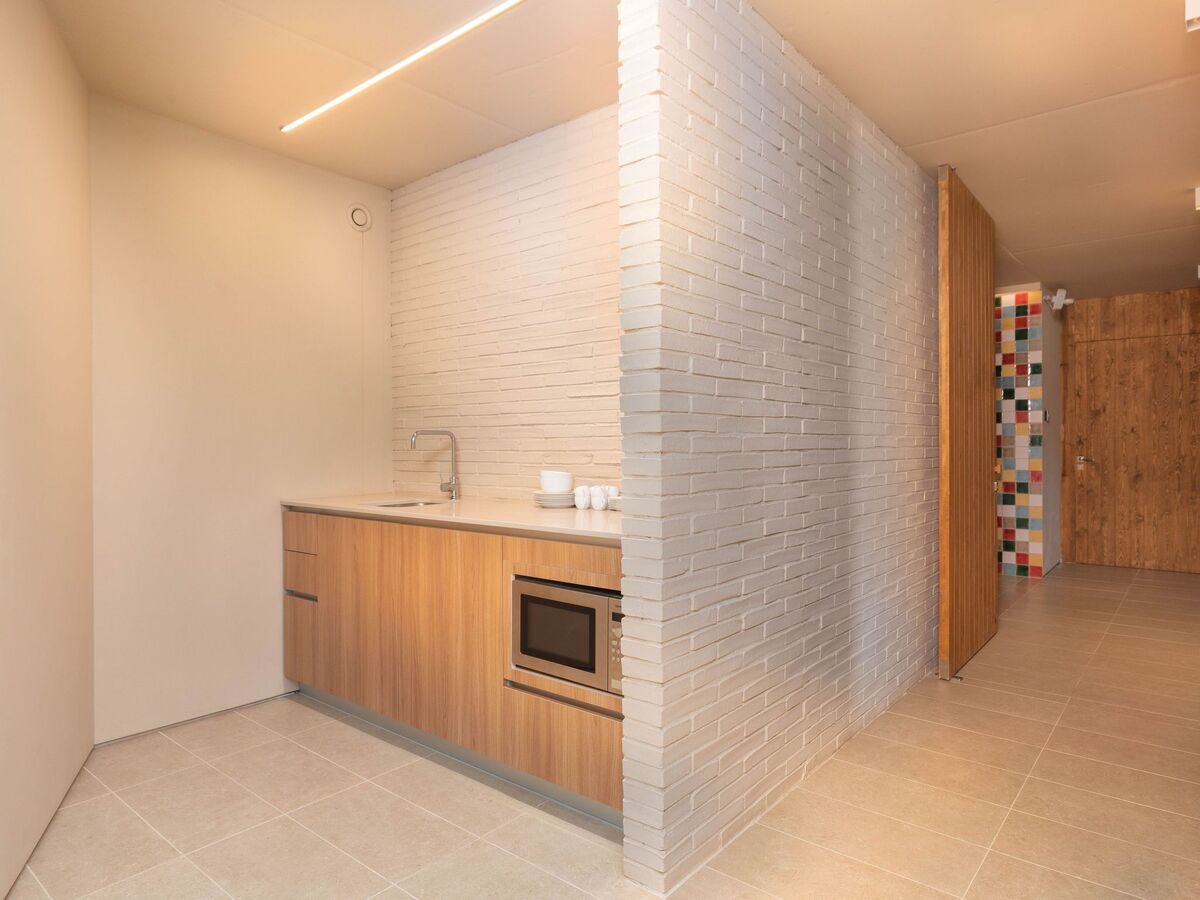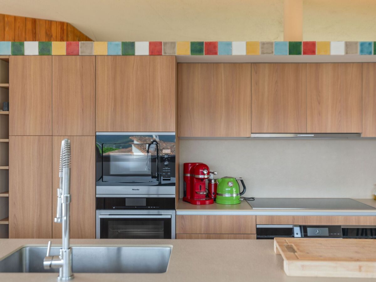 The upper floor enchants with a luxuriously equipped open-plan kitchen, featuring modern appliances such as a microwave, oven, dishwasher and a kitchen island.