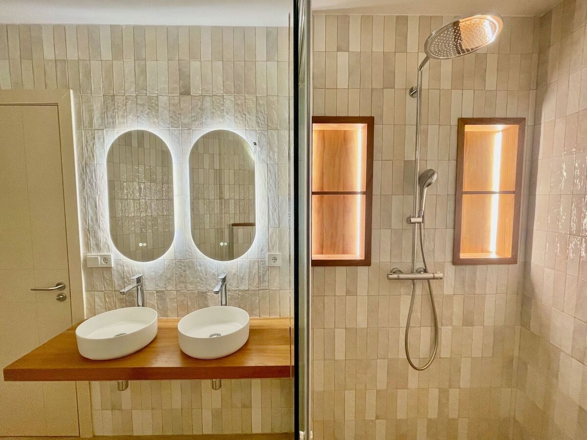 The upper floor holds three bedrooms with impressive sea view and two bathrooms with a bathtub and shower.