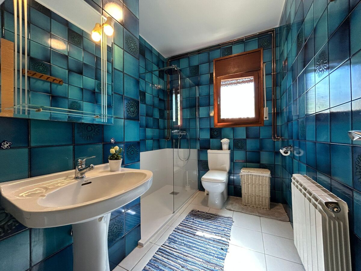 La salle de bain est équipée d'une douche, d'une fenêtre de salle de bain, d'un WC et d'un lave-mains.