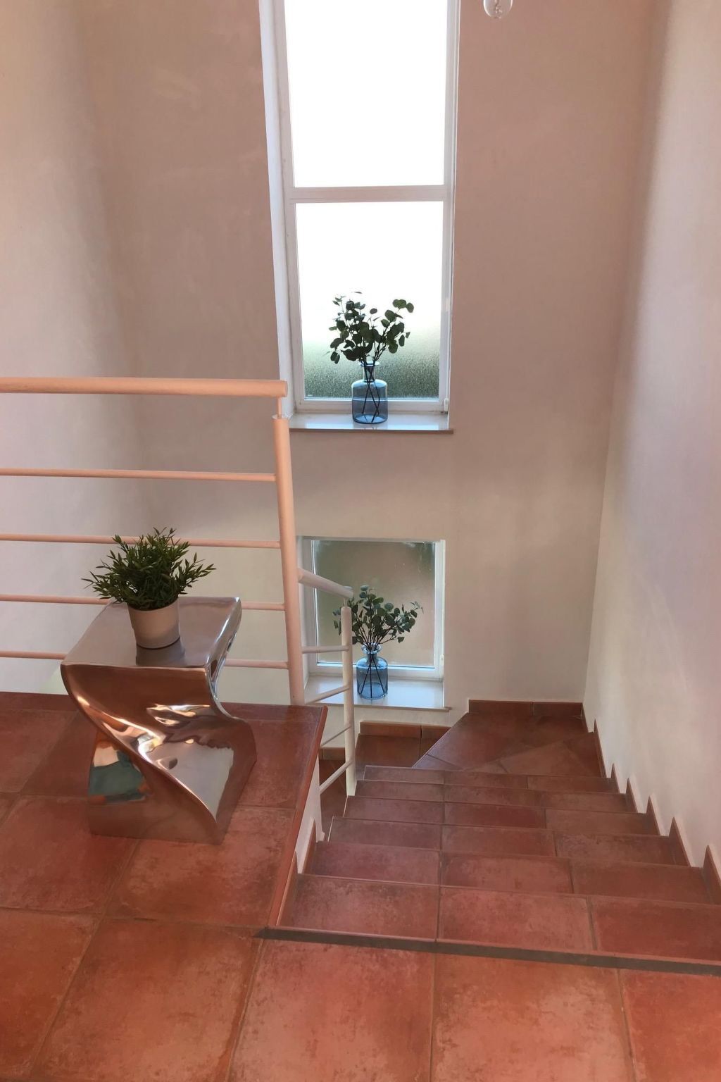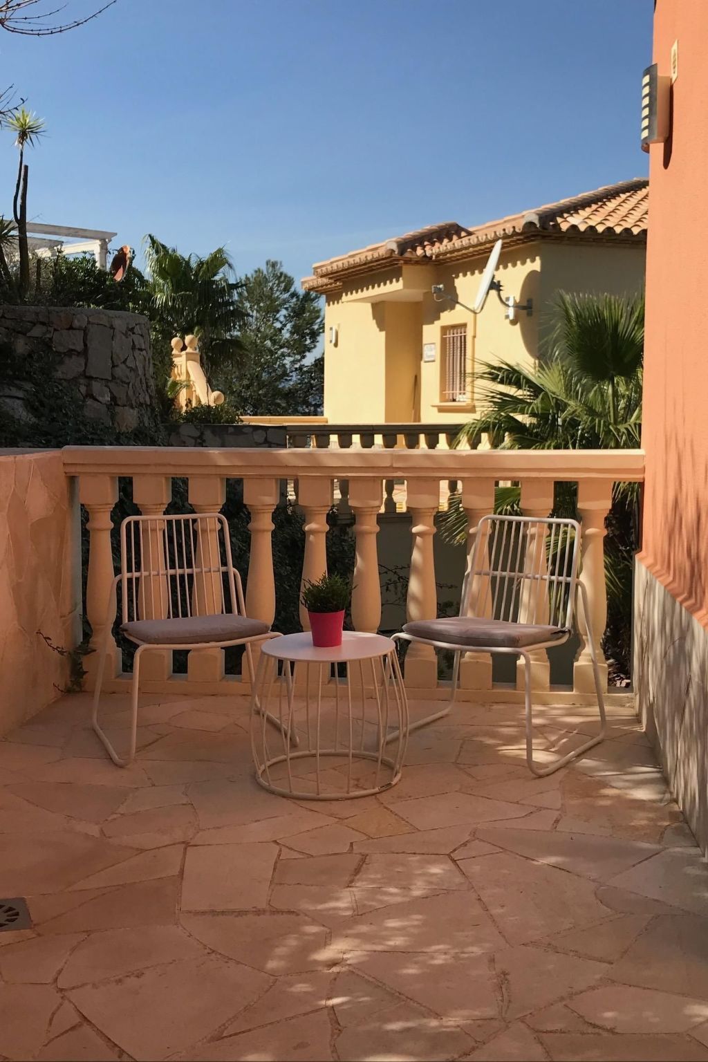 There is also a balcony, which is accessible from the bedrooms, and a small terrace in front of the house with a seating area.