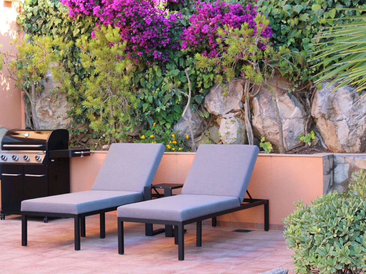 The outdoor area invites you to relax with a large, partially covered main terrace with an 8 x 4 metre pool, outdoor shower, parasol and sun loungers, as well as a seating area and lounge chairs.