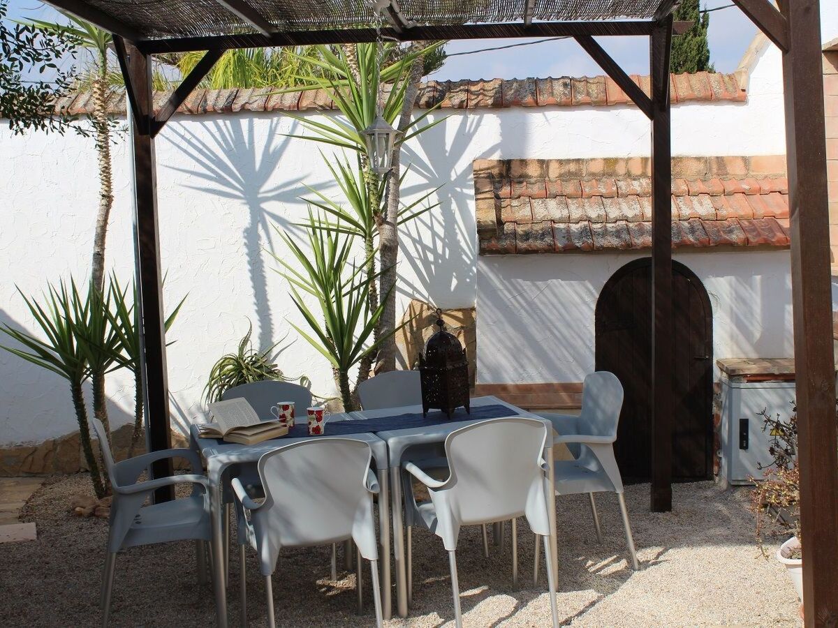 Un barbecue, avec tables et chaises, se trouve dans la jardin, ainoi qu´une pergola.