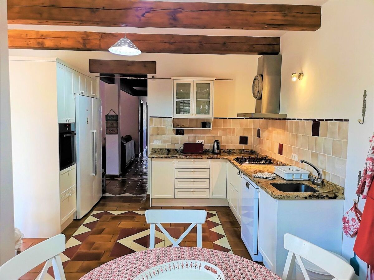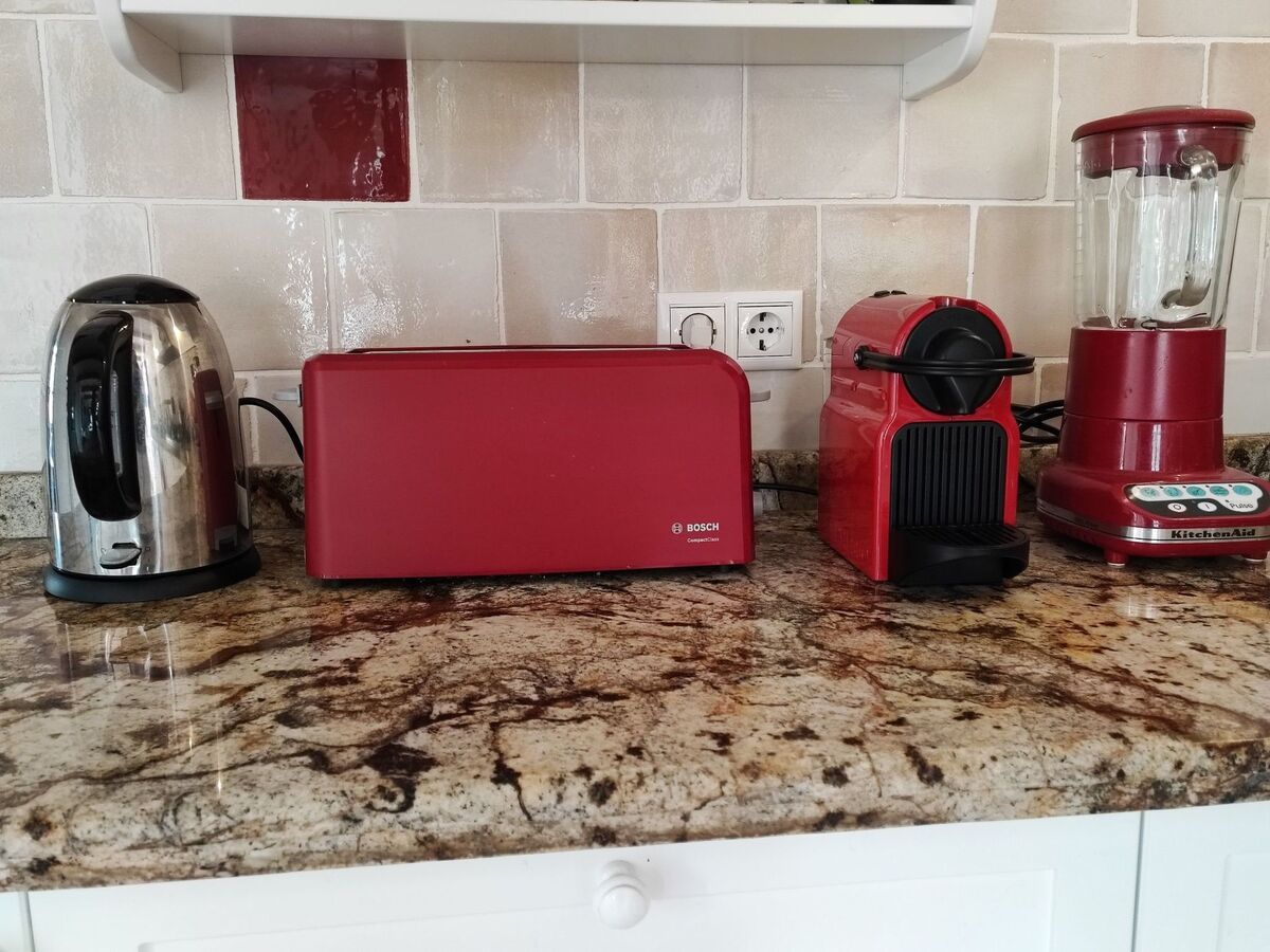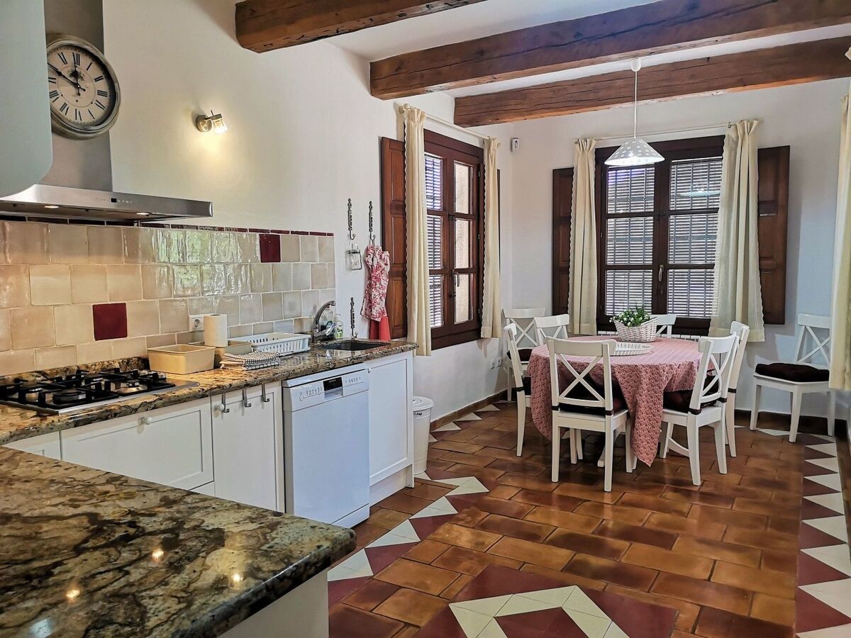 The fully equipped kitchen with double fridge-freezer, oven, dishwasher, gas hob, Nespresso coffee machine, toaster, kettle, blender and a dining area with morning sun is available for individual self-catering and free time management.