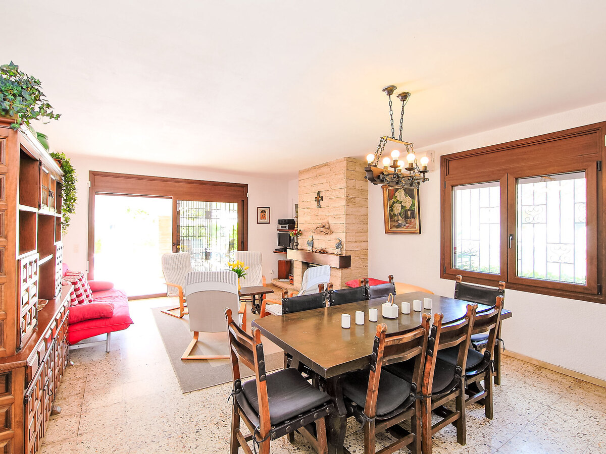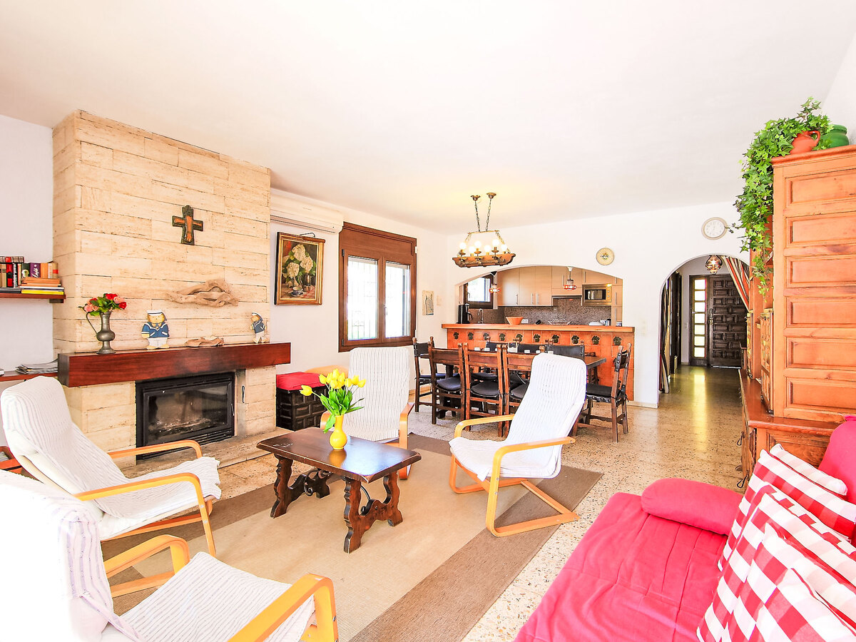 Aménagement simple et rustique: séjour/salle à manger avec cheminée et TV (satellite) (écran plat), air-conditionné.