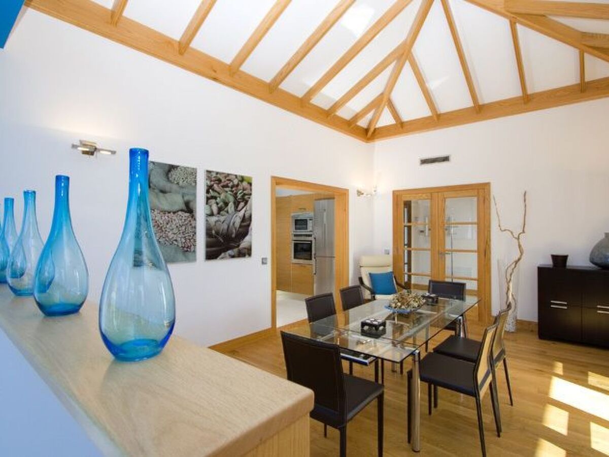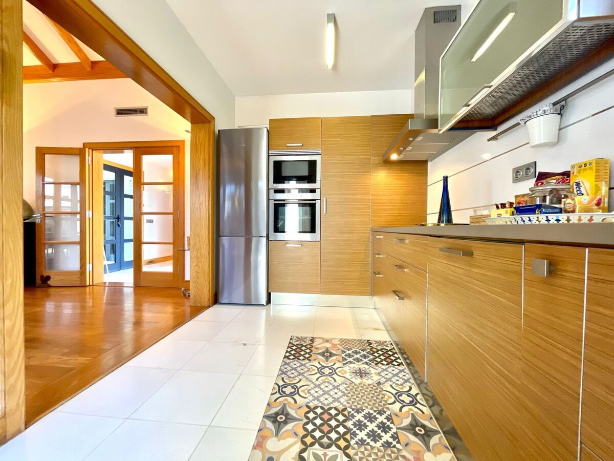 The separate kitchen is fully equipped with top of the line appliances and utensils, accompanied by a utility room with washing machine, tumble dryer, and other necessities for an extended stay.