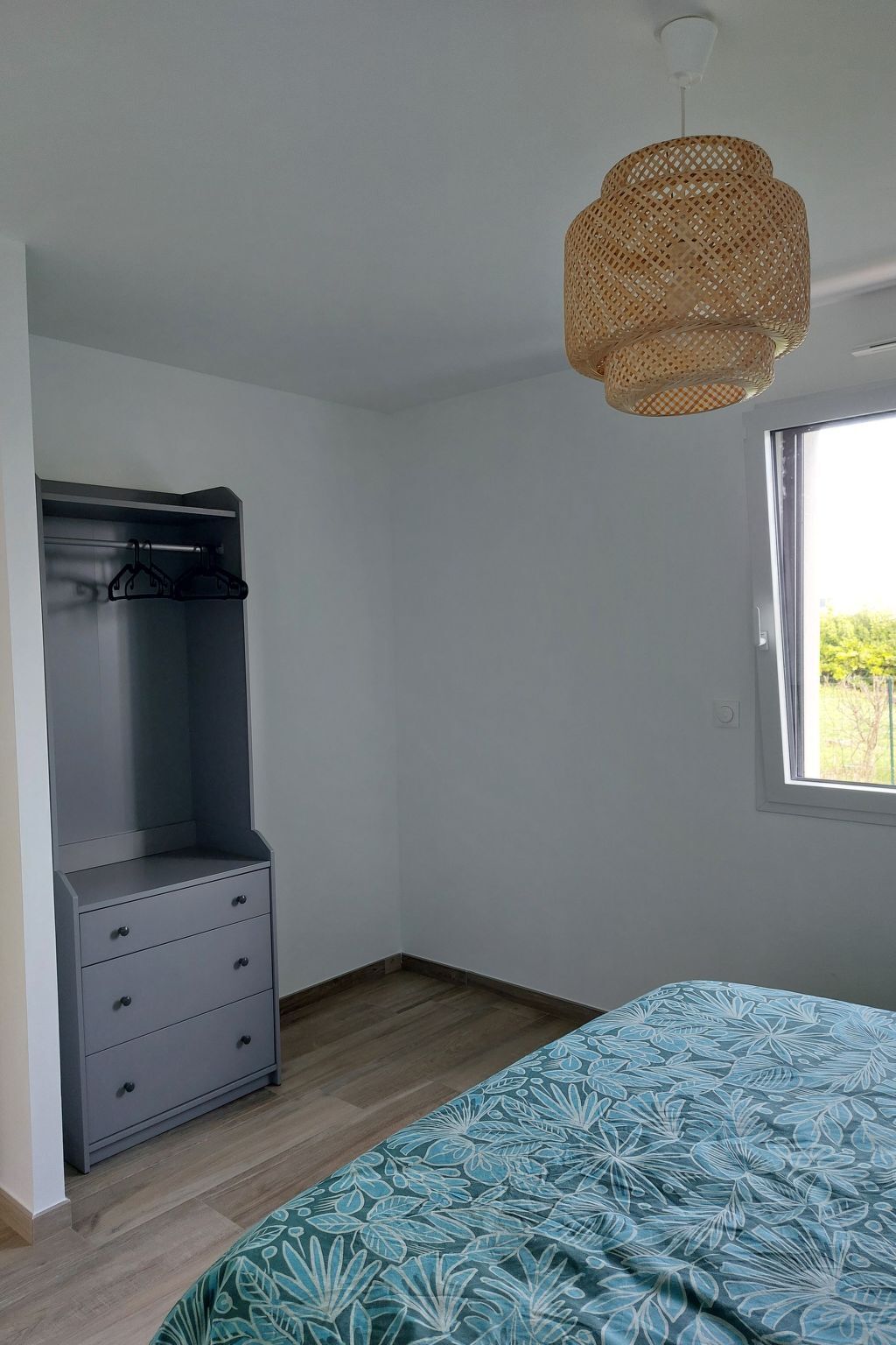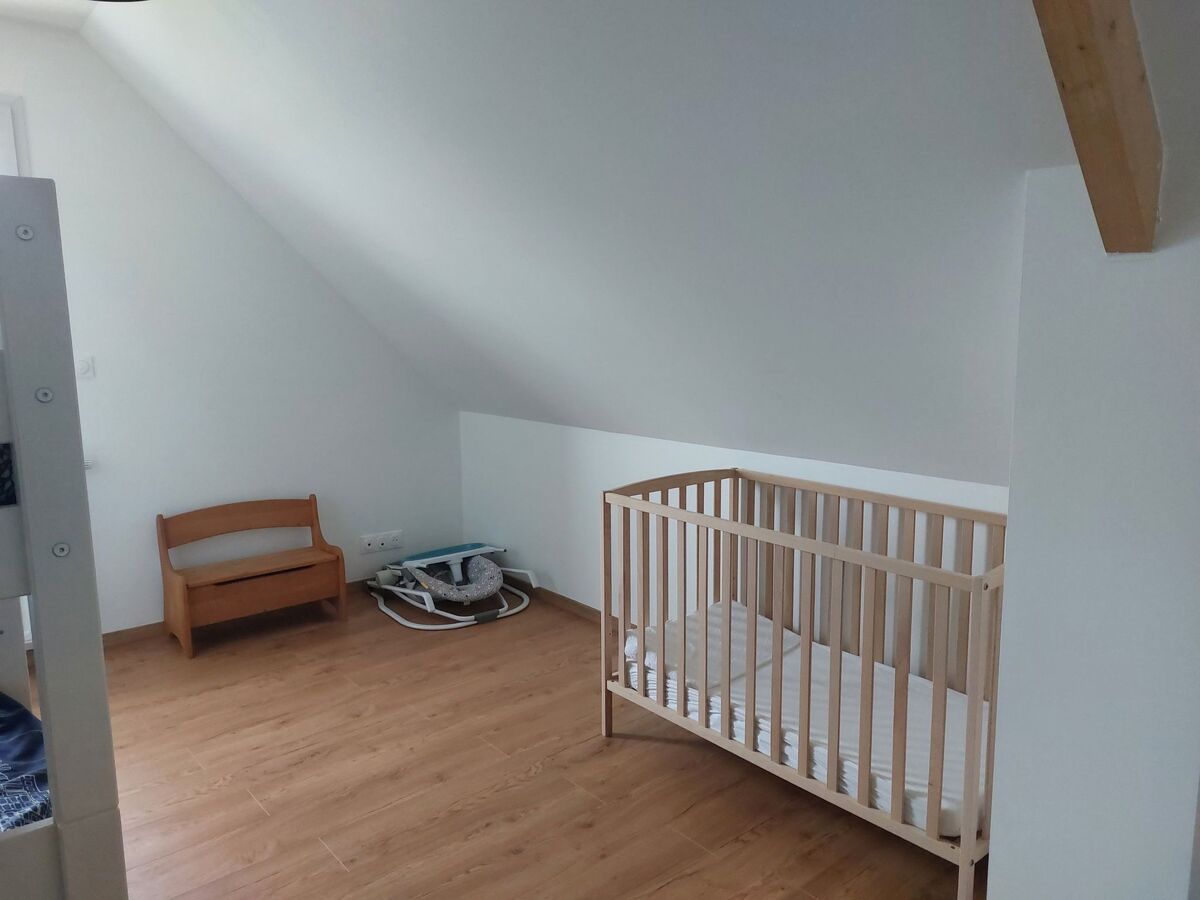 Escaliers permettant d'accéder à l'étage desservant une chambre double avec lieu dédié au télétravail (prise RJ45 pour connection internet par la fibre), une seconde chambre double, et une troisième chambre avec lits superposés, lit-bébé et un lit-tiroir supplémentaire.