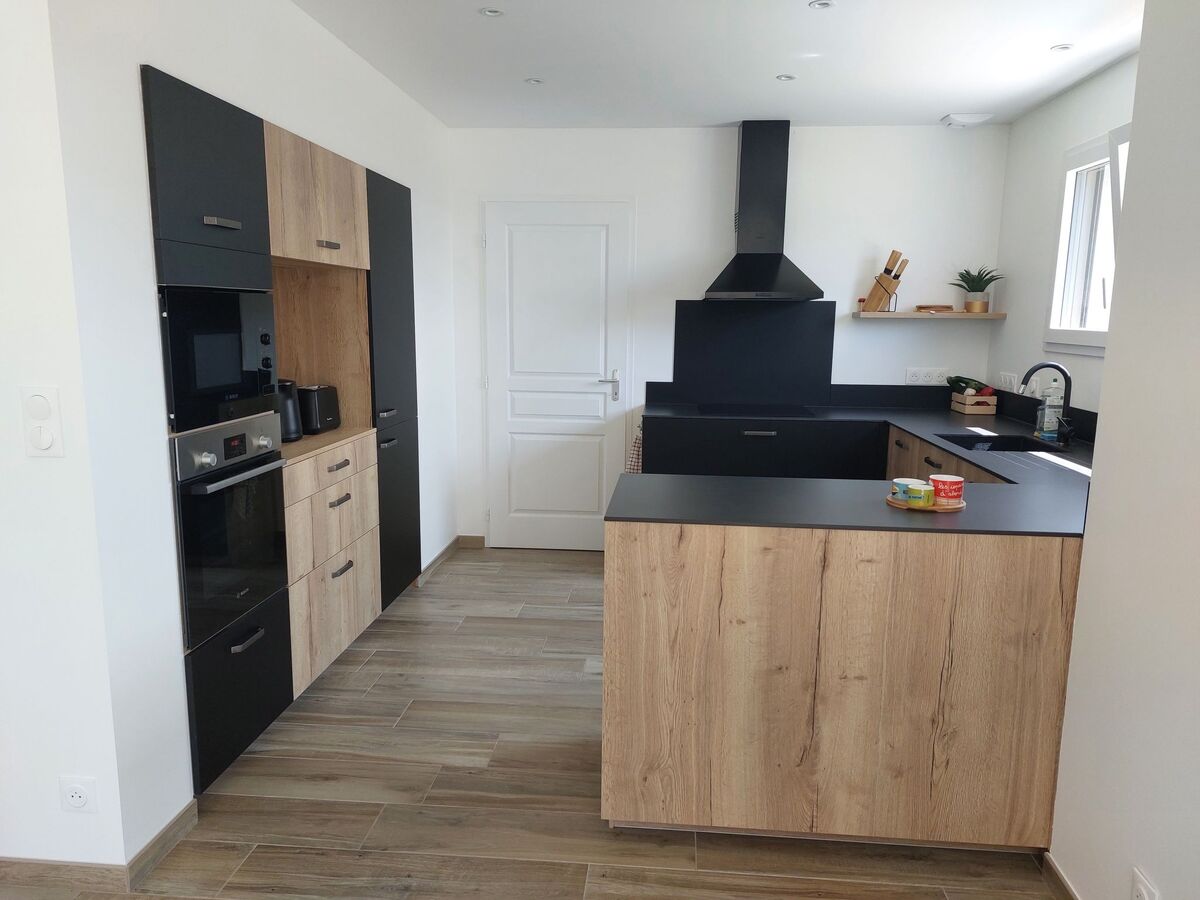 Maison complète d'une surface de 115m2 composée d'un espace ouvert salle/salon donnant sur une cuisine aménagée complète.