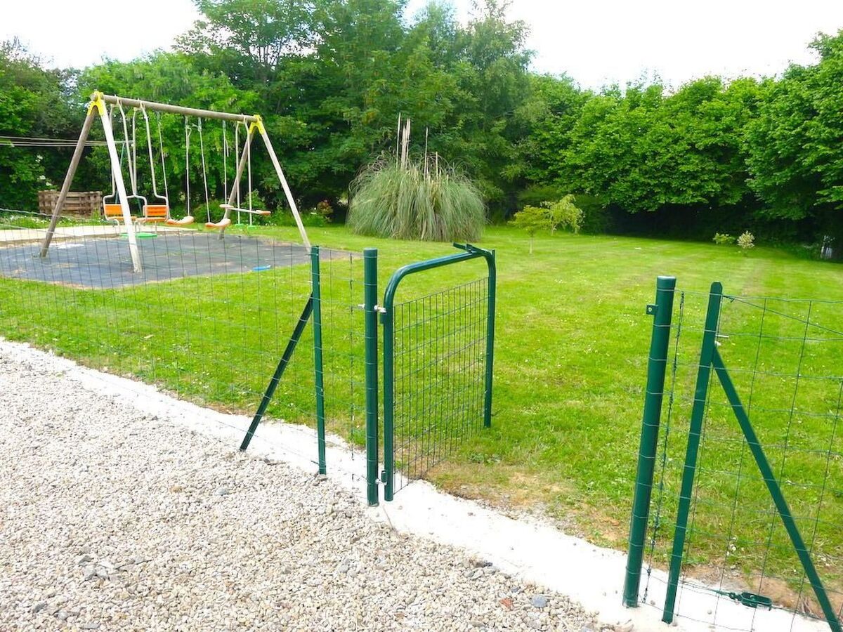 The living room opens onto the private interior courtyard with a grill, a dining table with chairs and a children’s playground with a swing.