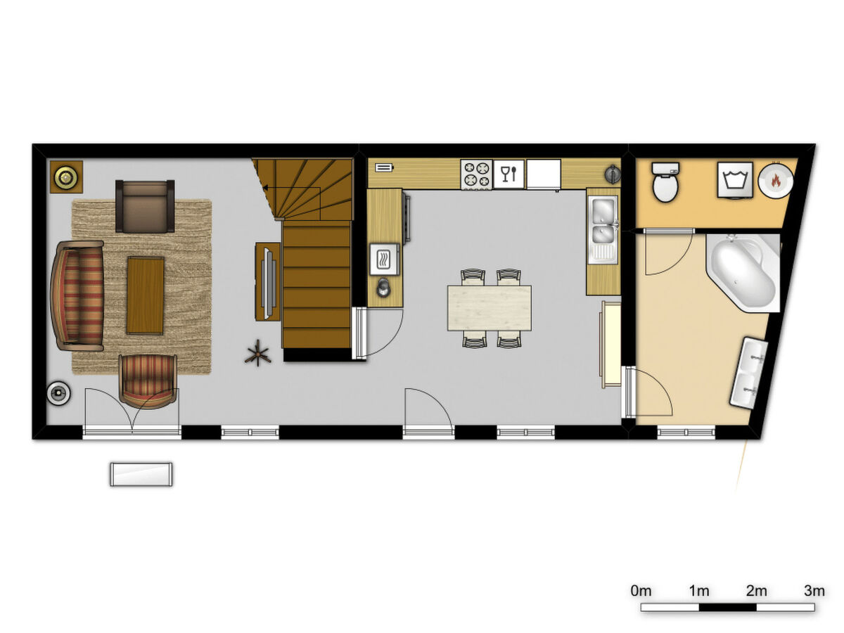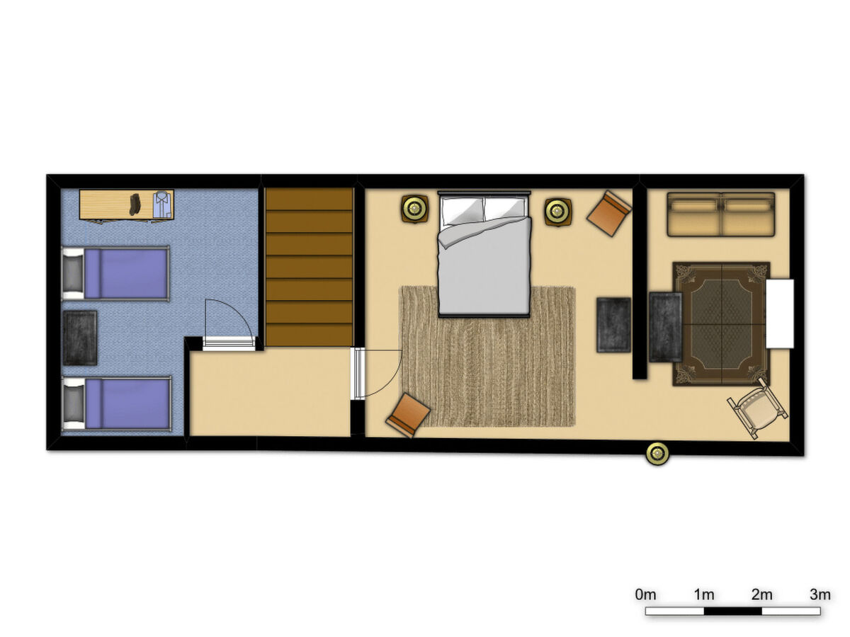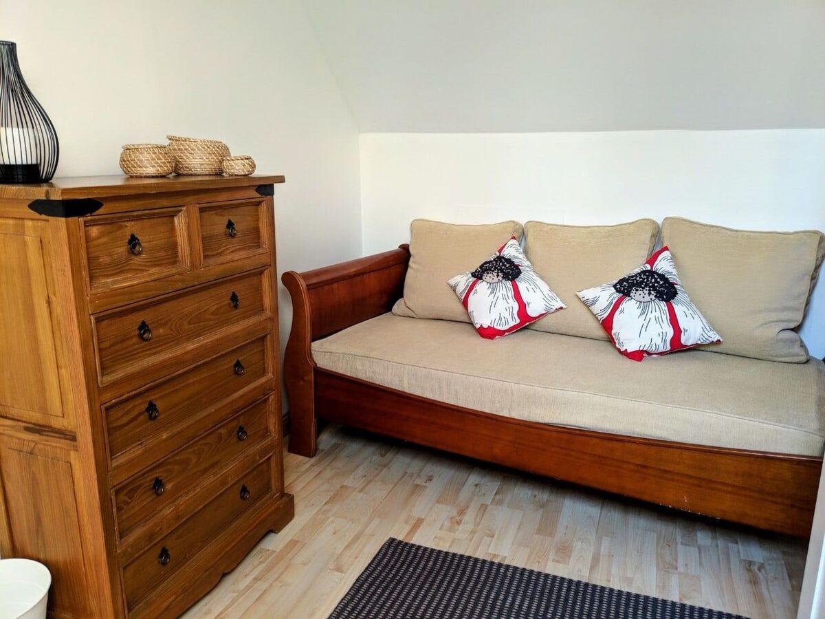Wide stairs lead to the upper floor with the bedrooms, of which one has a double bed (140 x 200cm) and the other has two single beds (90 x 200cm) that can also be joined together as a double bed.