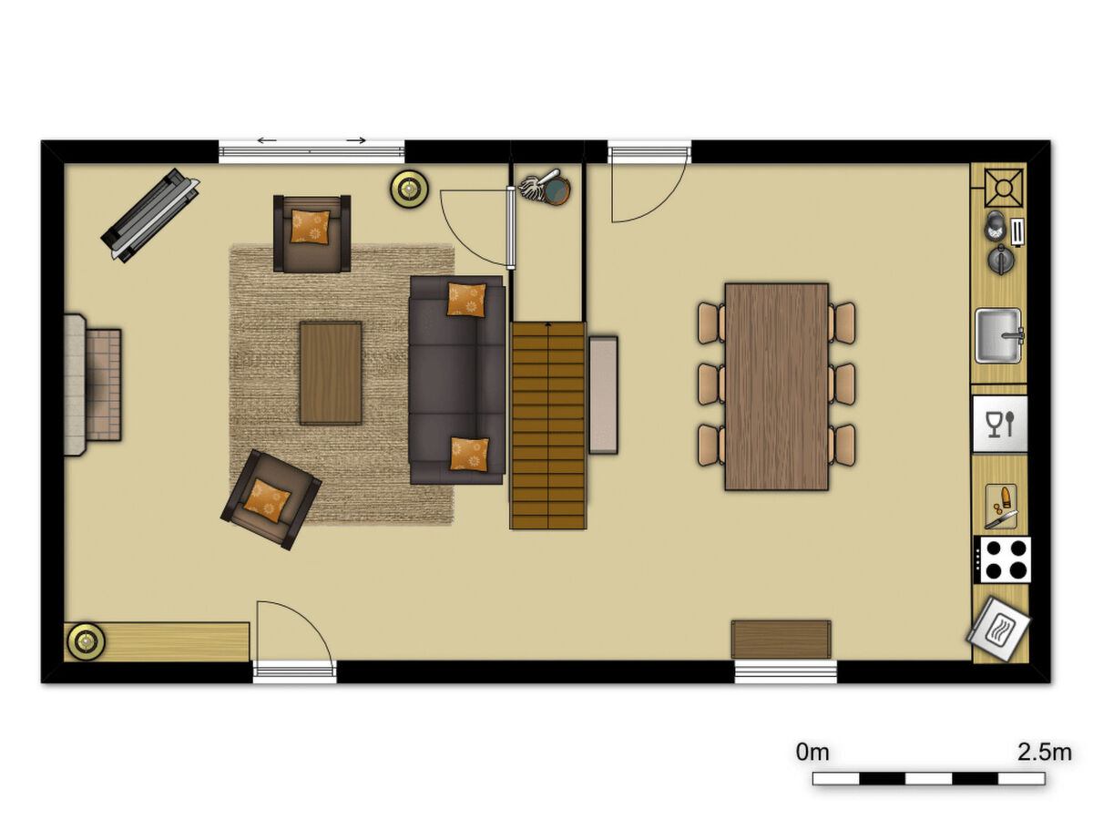 The ground floor has a generous and cosy living room with a fireplace, a 70cm colour TV (satellite channels, incl.