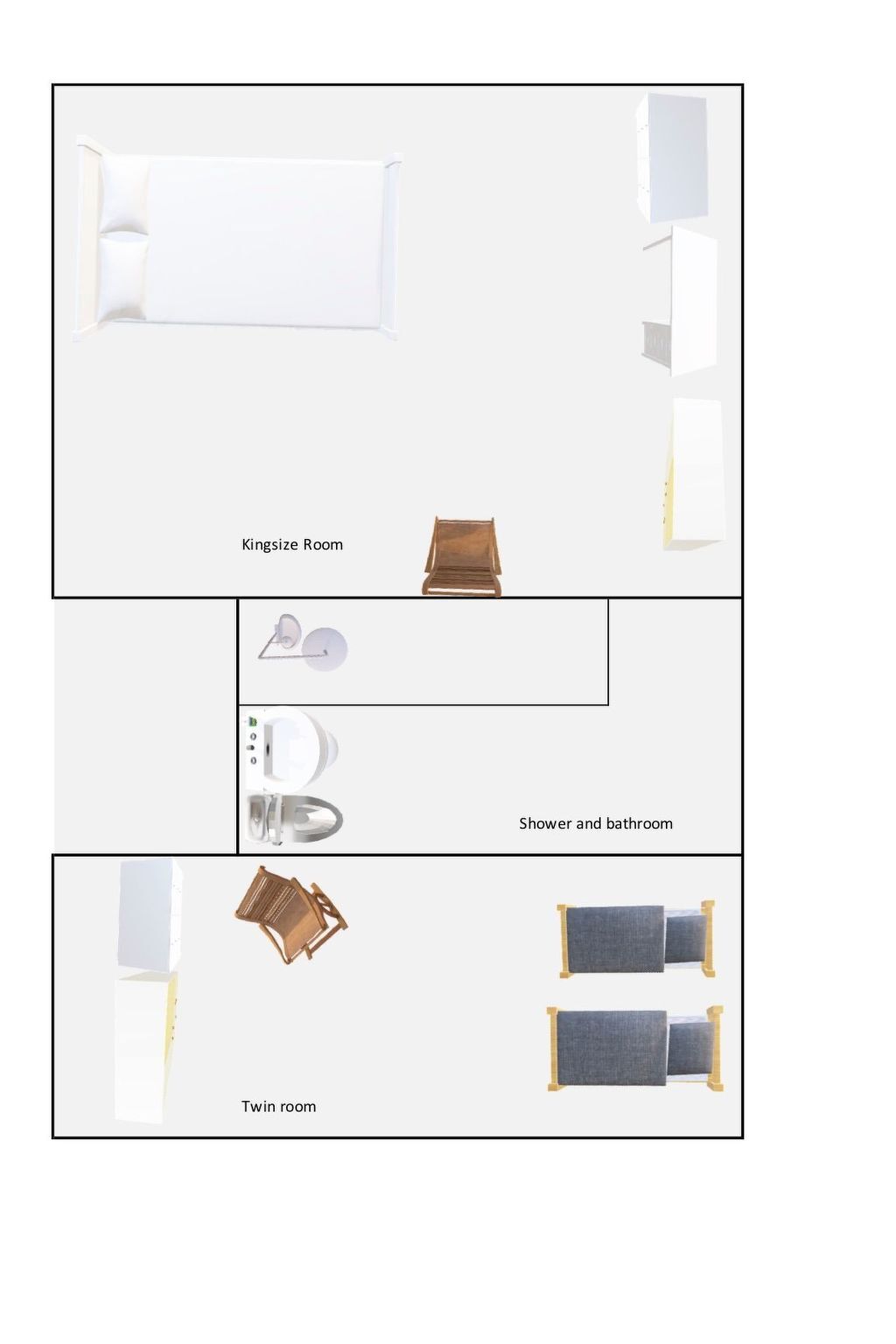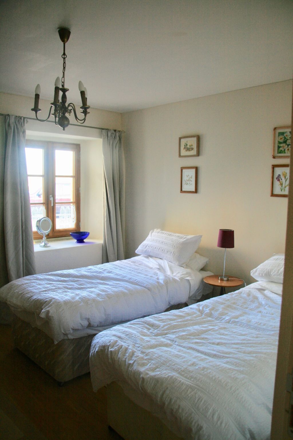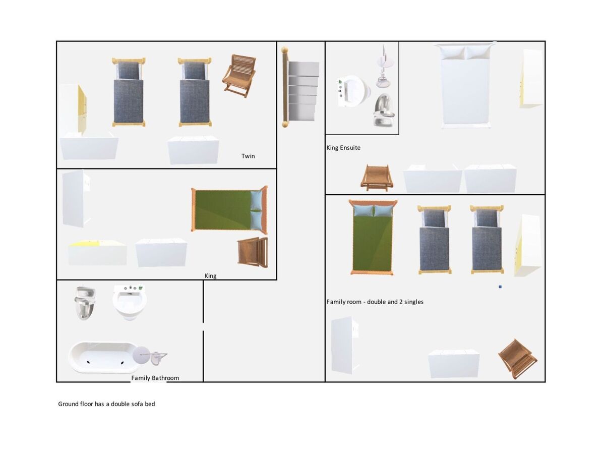 The bedrooms comprise of a large high ceiling kingsize room with a baby cot and a twin room.