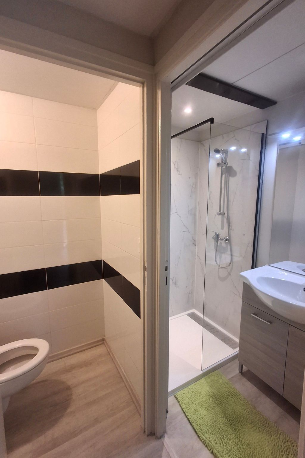 Cuisine équipée : grand frigo congélateur, lave-vaisselle, plaque de cuisson, hotte aspirante, micro-ondes, cafetière électrique, vaisselle.