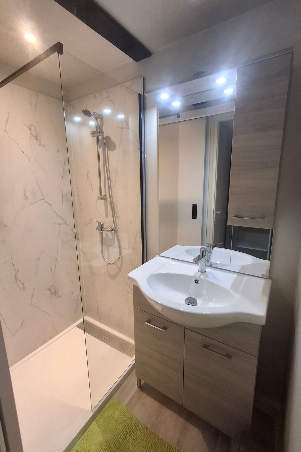 Une belle salle d’eau avec douche à l’italienne, meuble lavabo et grand miroir.