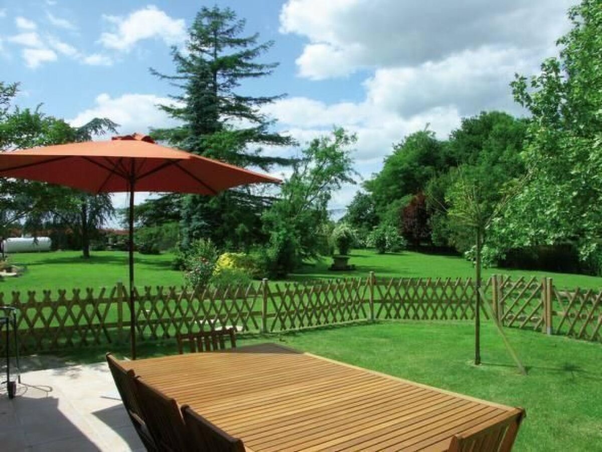 La grande porte-fenêtre du salon permet d'accéder à la terrasse meublée et au parc où se trouve l'étang.
