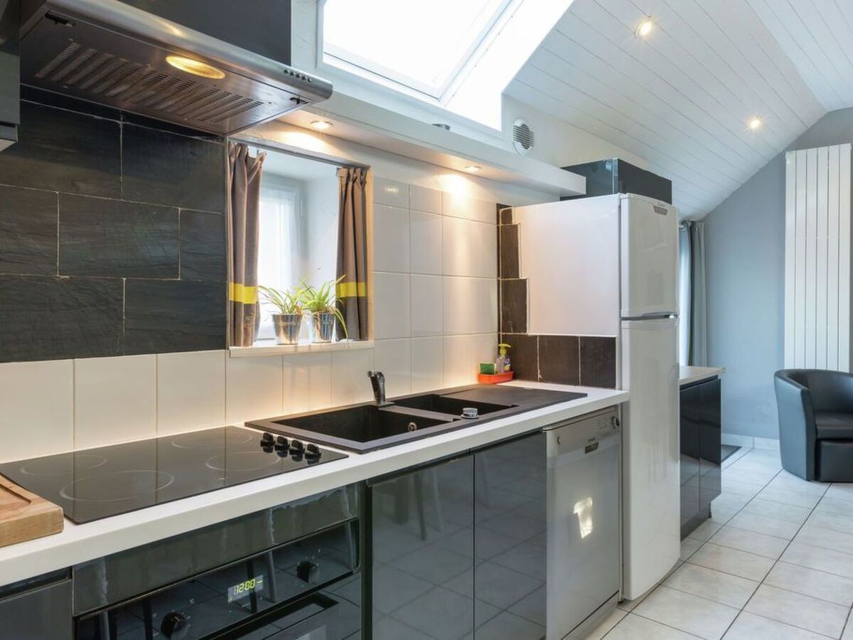 Le rez-de-chaussée présente un salon avec un canapé-lit convertible, une cheminée avec insert, une kitchenette équipée, et une salle d'eau avec WC.