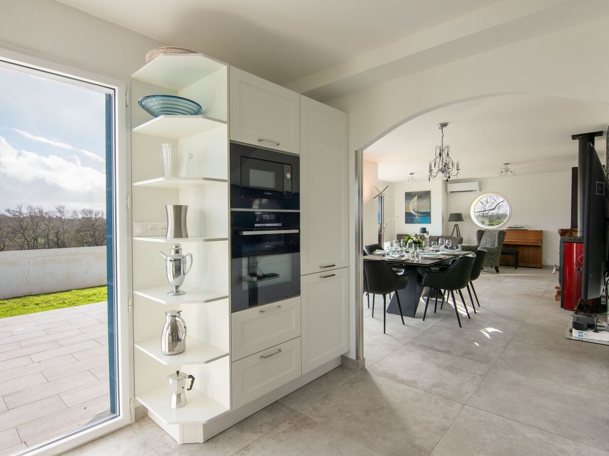 The architect-designed villa has a large open-plan living/dining area with a semi-open-plan kitchen and several access points to various terraces.