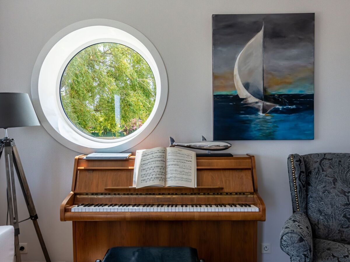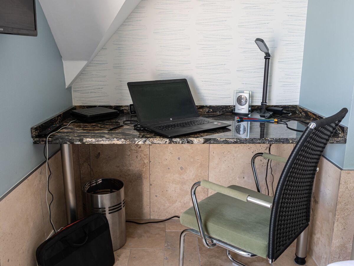 On the upper floor there are a further three bedrooms, another living and reading room as well as an office with desk, printer and screen, a bathroom and the largest bedroom in the house has its own shower and washbasin directly in the room.