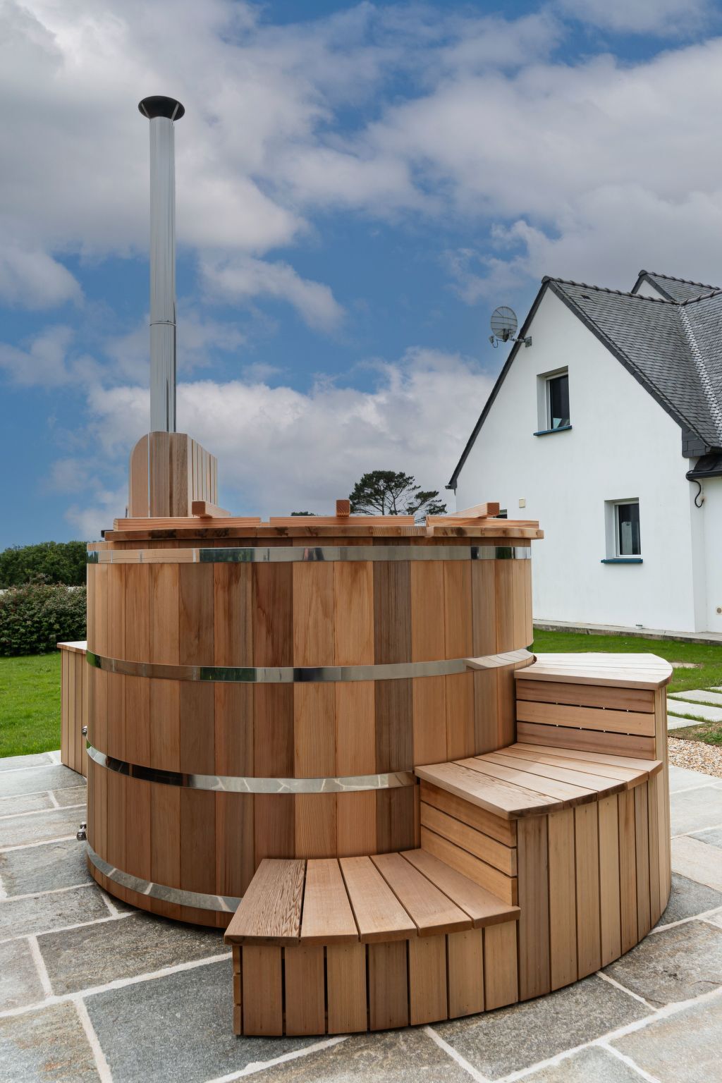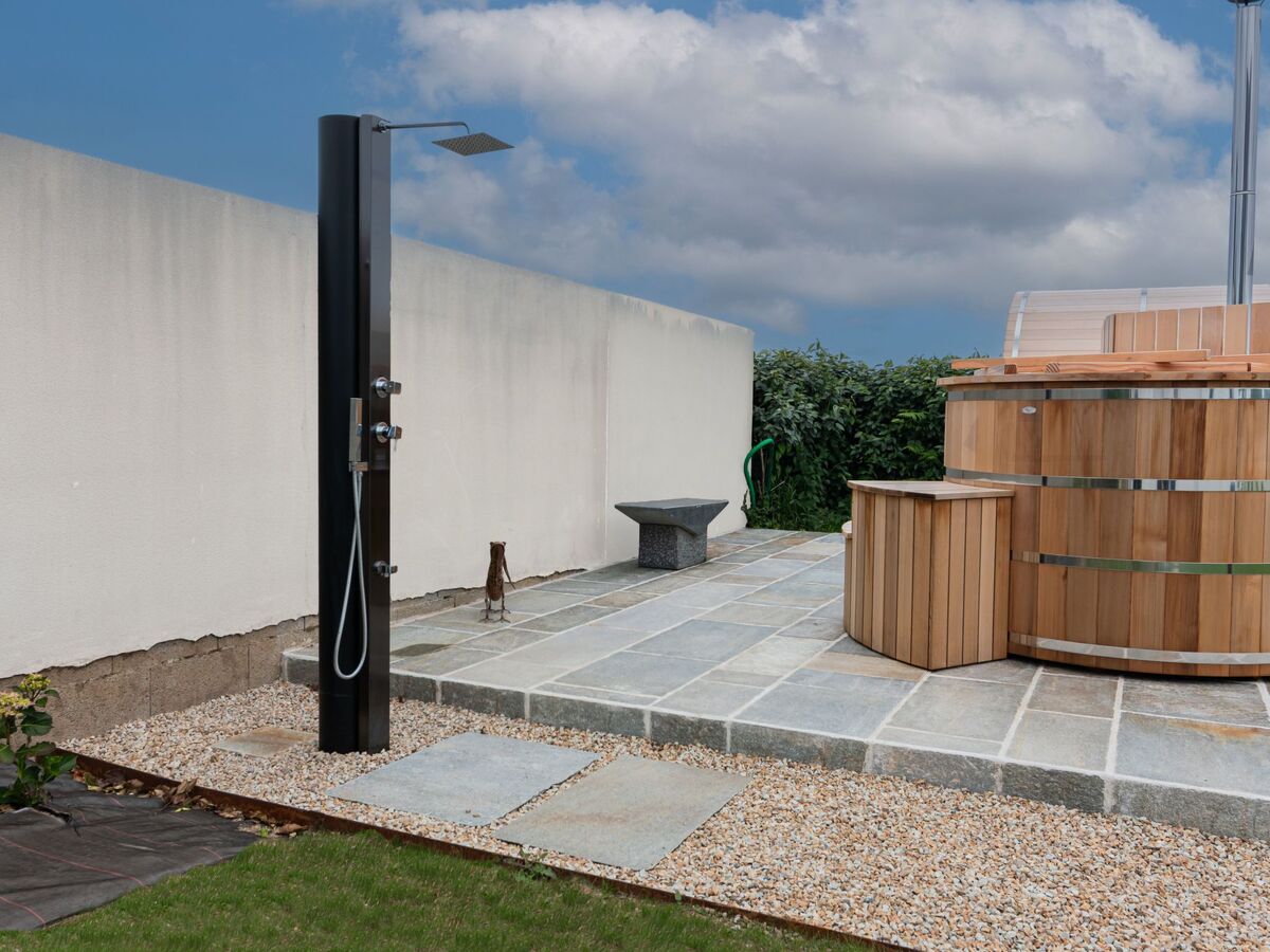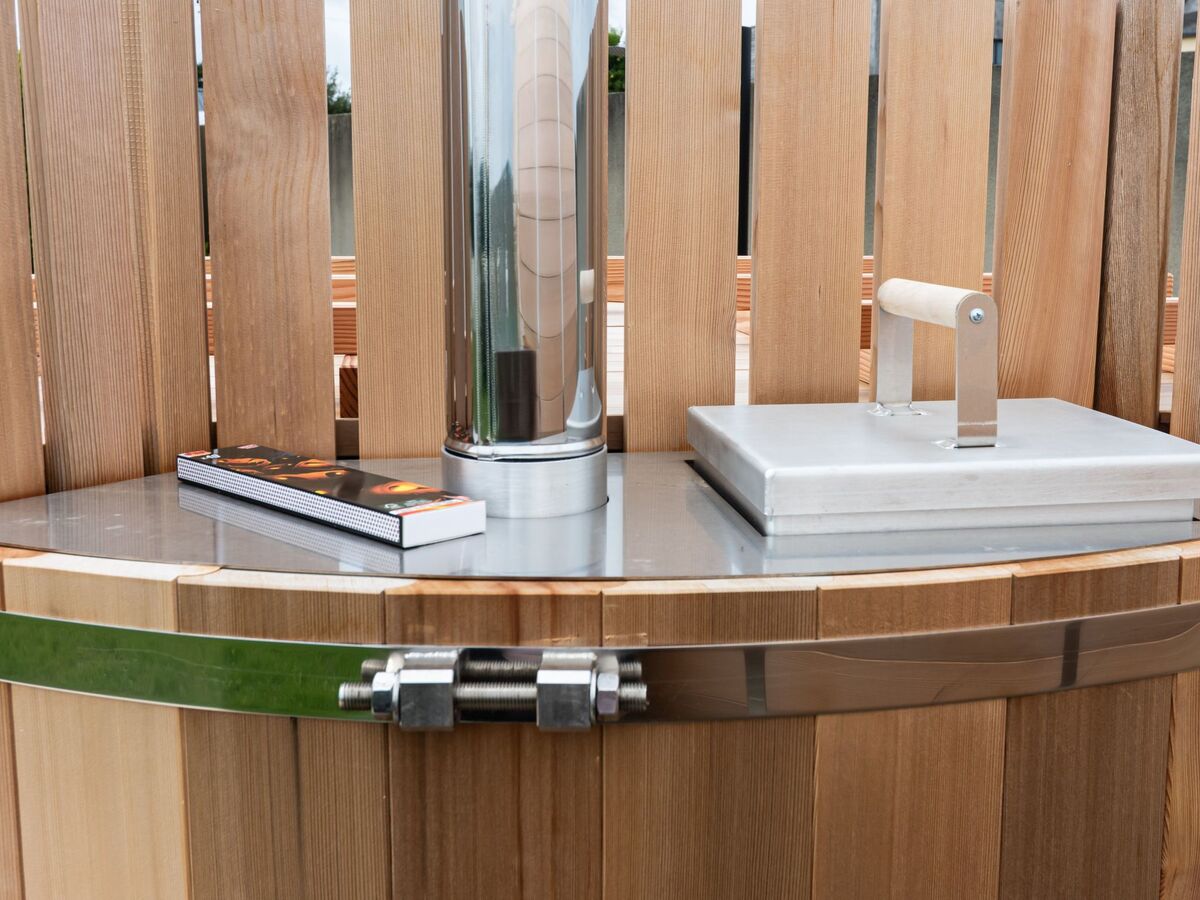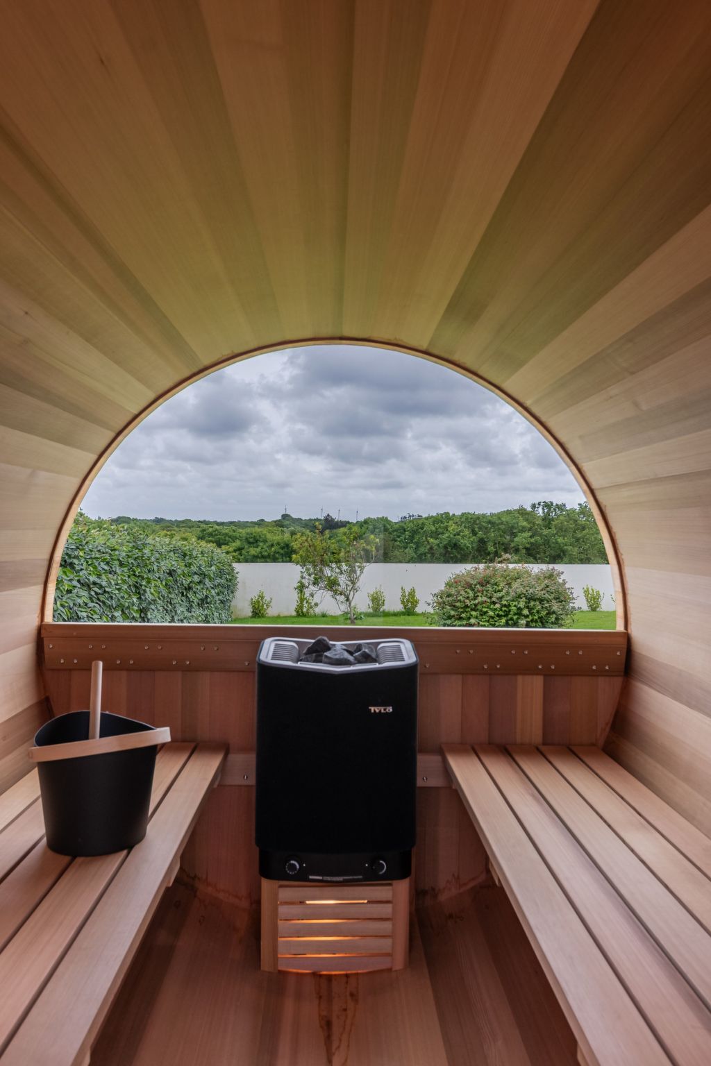 There you will find a Nordic bath, heatable with electricity or firewood, a large barrel sauna, outdoor shower, granite bench and outdoor lighting.