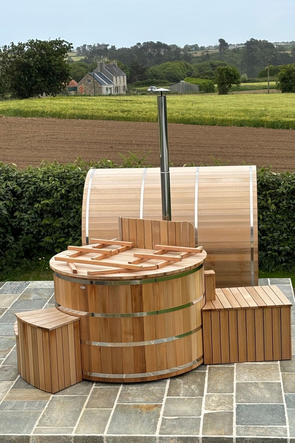 There you will find a Nordic bath, heatable with electricity or firewood, a large barrel sauna, outdoor shower, granite bench and outdoor lighting.