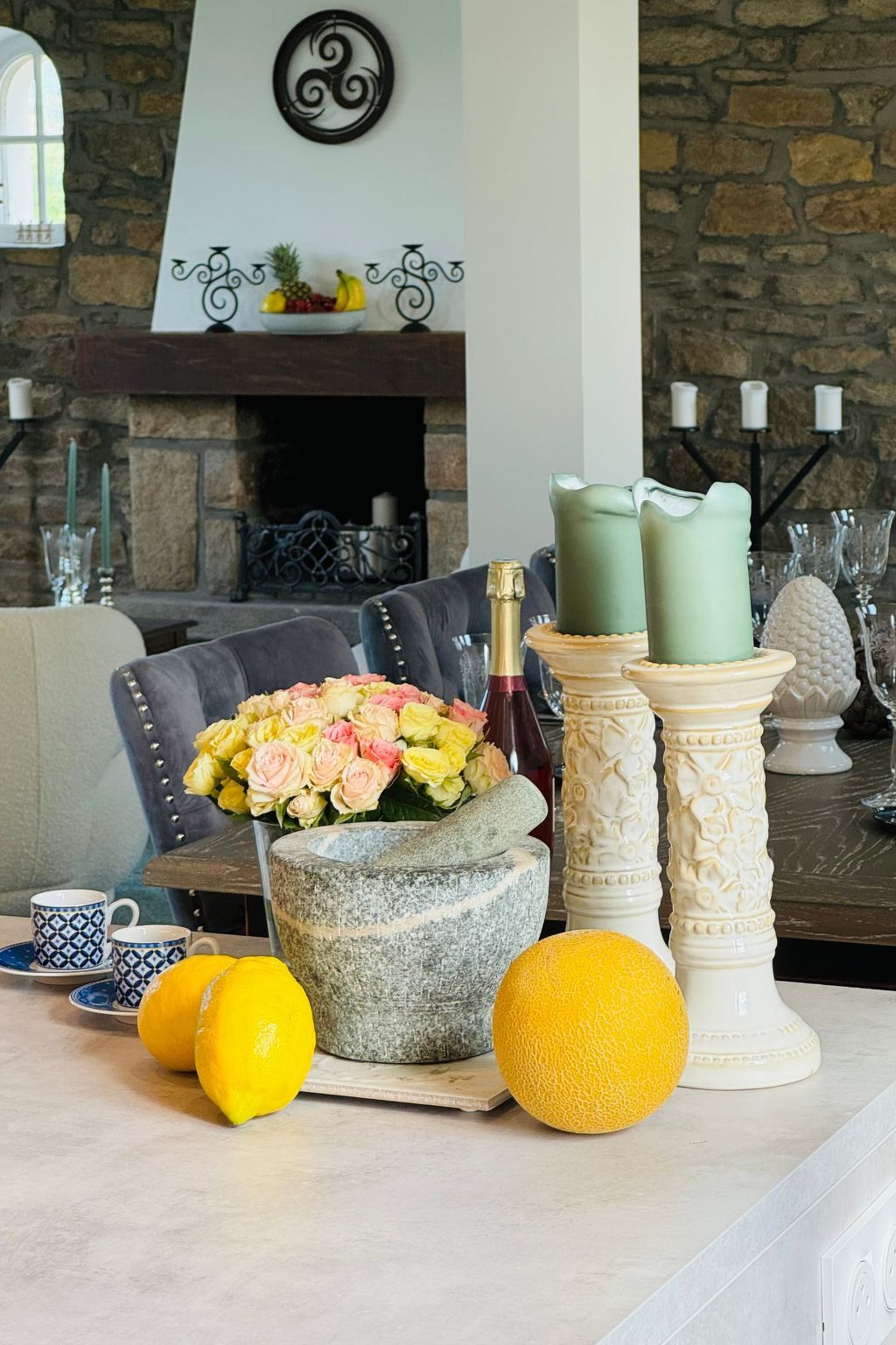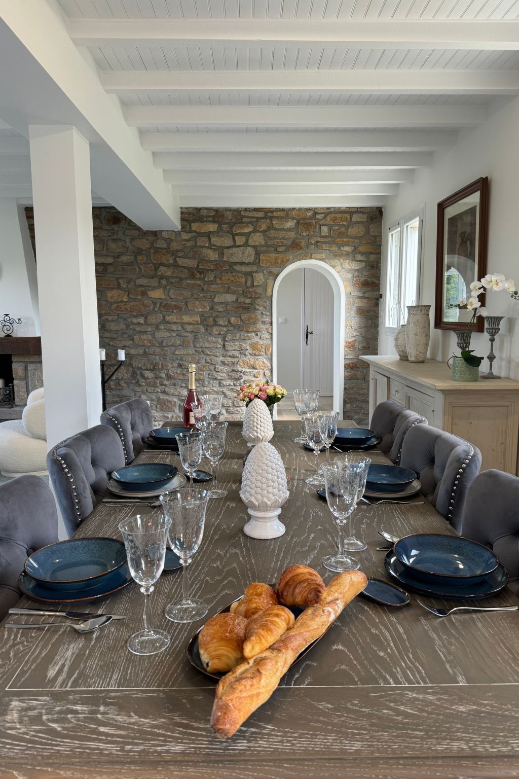 There is a large dining table and a sofa and armchair combination in front of the Breton granite fireplace.