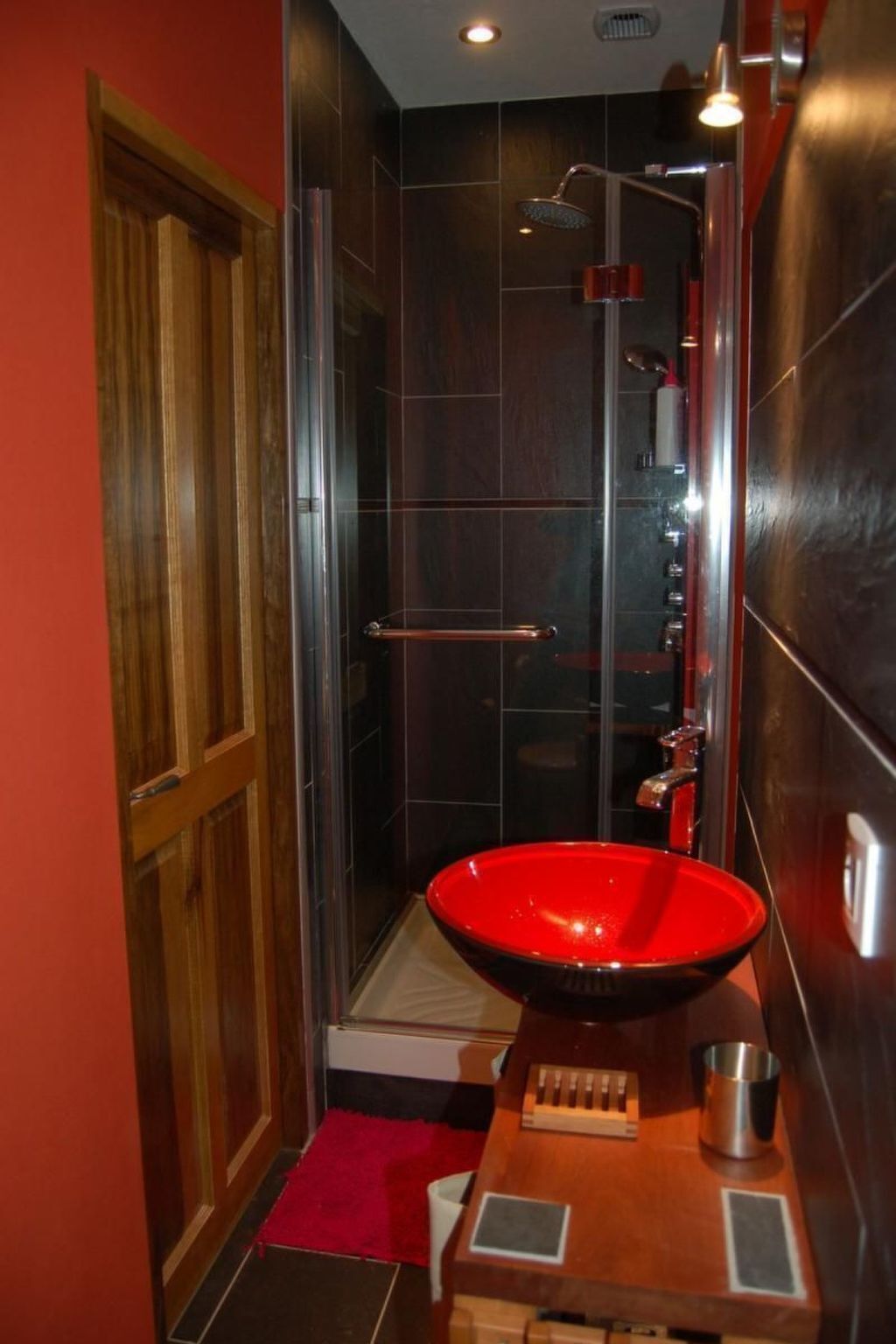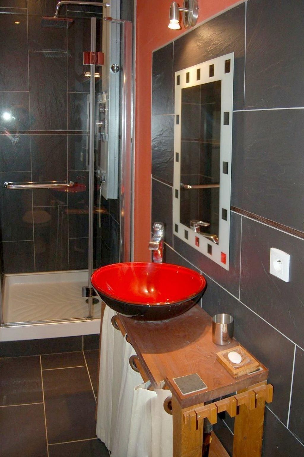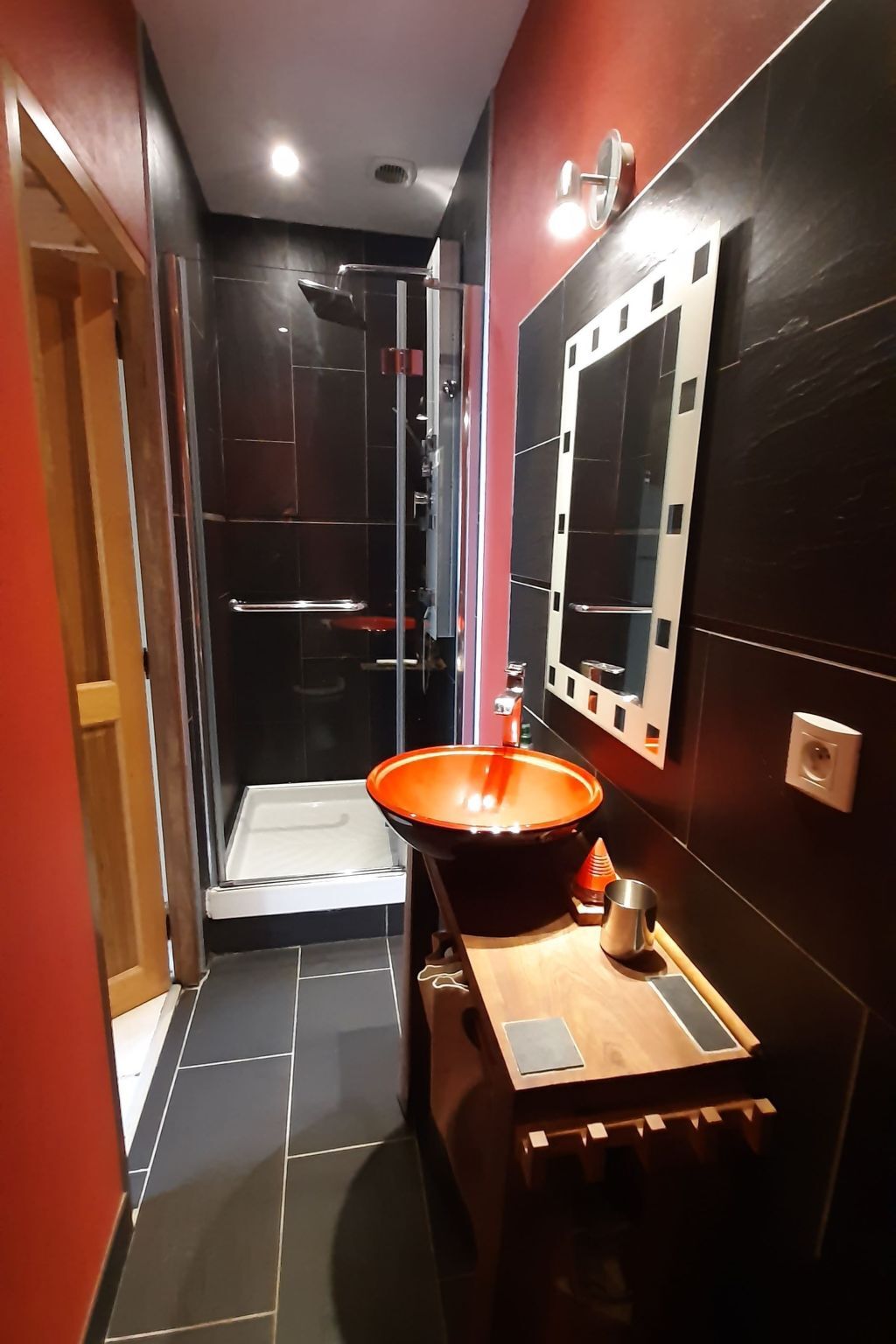 En plus, on trouve une salle de bain avec cabine de douche, lavabo et wc.