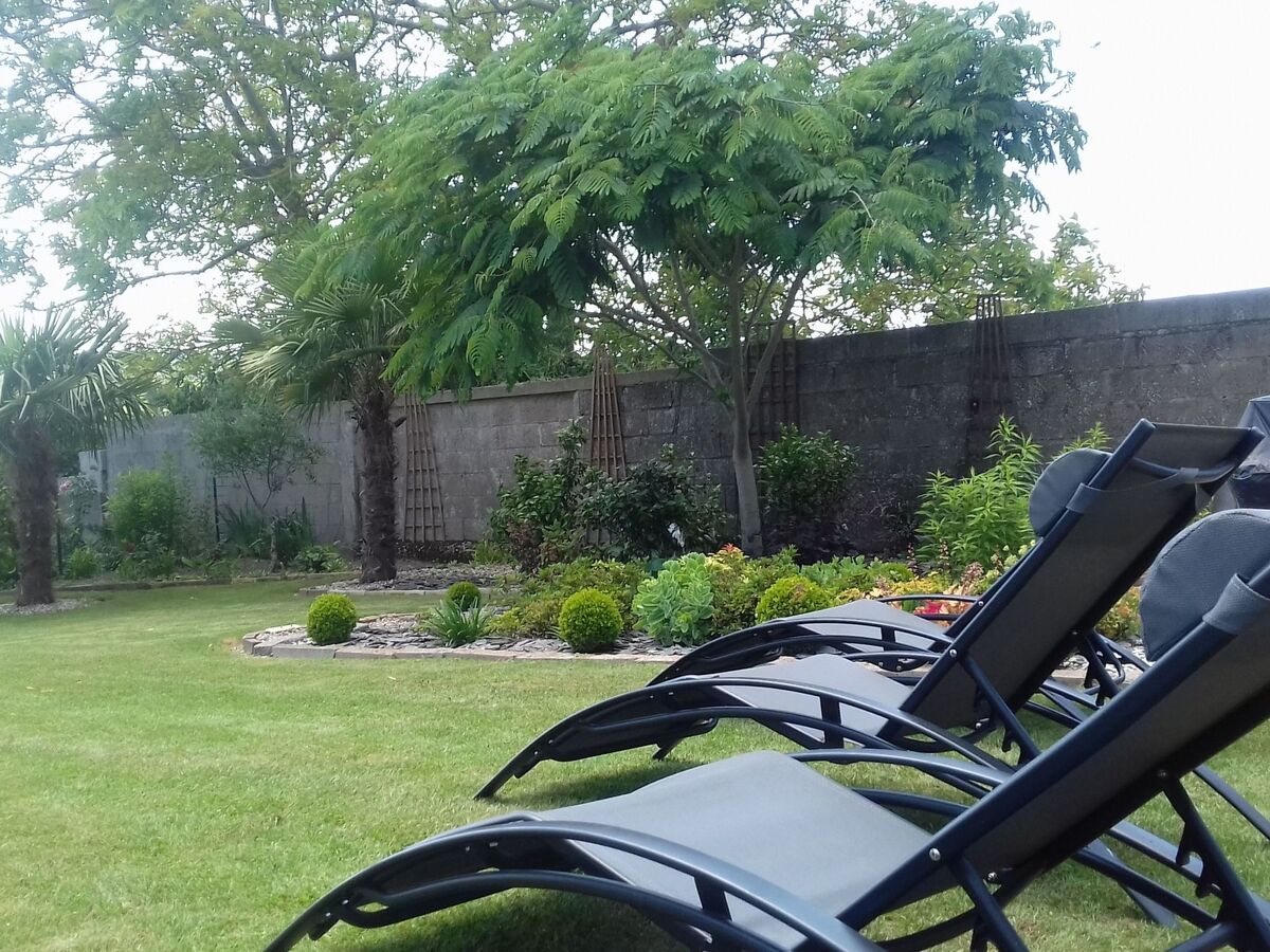 La terrasse en bois du jardin de 500m² est aménagée avec des tables, des chaises, des transats et un grill.