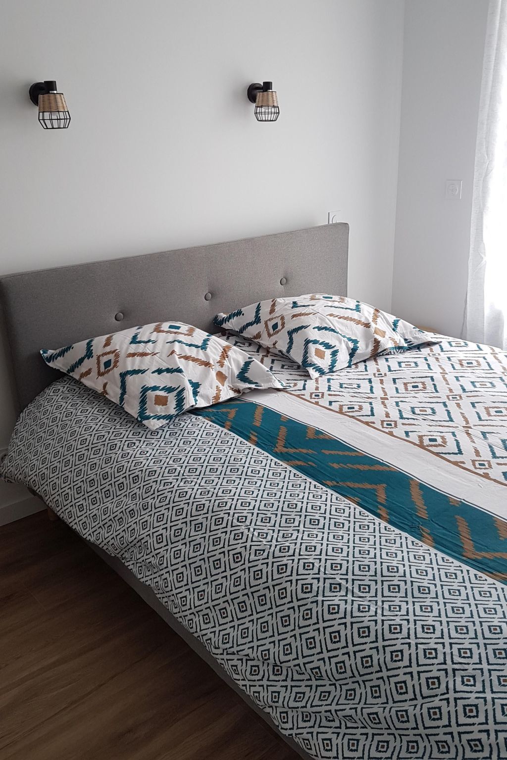 Trois chambres à coucher avec lit double de 160 et une quatrième chambre avec deux lits simple de 90 ; une cuisine toute équipée avec cuisinière, four, four à micro-ondes, cafetière coin repas pour huit personnes ainsi qu'un réfrigérateur et lave vaisselle .