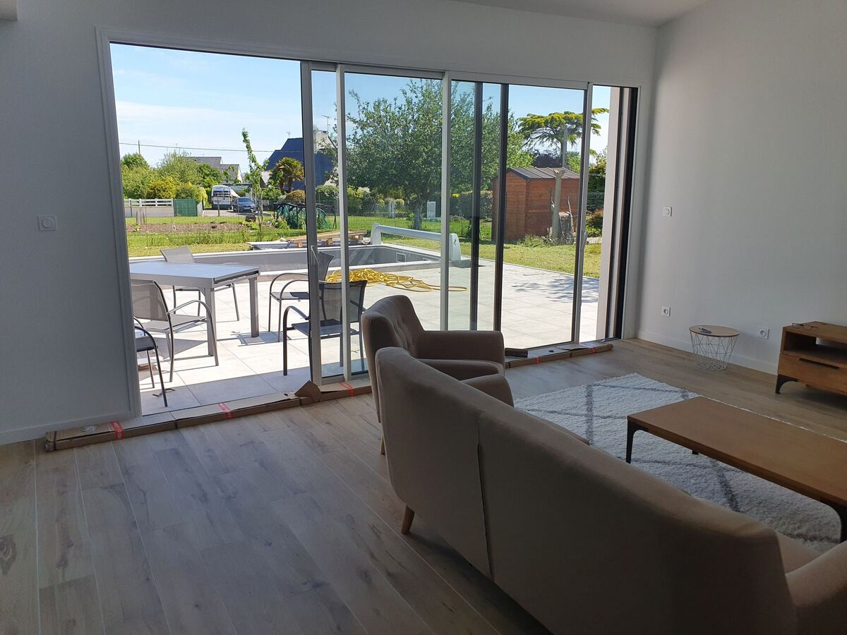 Maison neuve de 130 m2 avec jardin à Fouesnant à 3 kms de la plage comprenant : cuisine équipée de 26 m2 (lave vaisselle , four , micro ondes, frigo congélateur; cafetière Nespresso...) ainsi qu'un salon de 32 m2 avec vue sur la piscine privative chauffée.