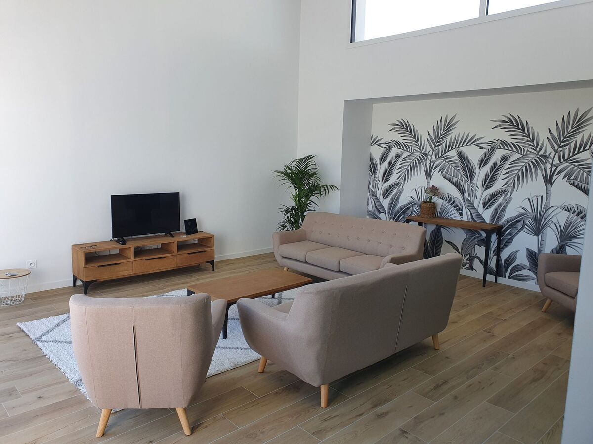 Elle est composé des pièces suivantes : un salon avec un téléviseur à écran plat 102 cm et deux canapés à trois places ainsi que deux fauteuils.