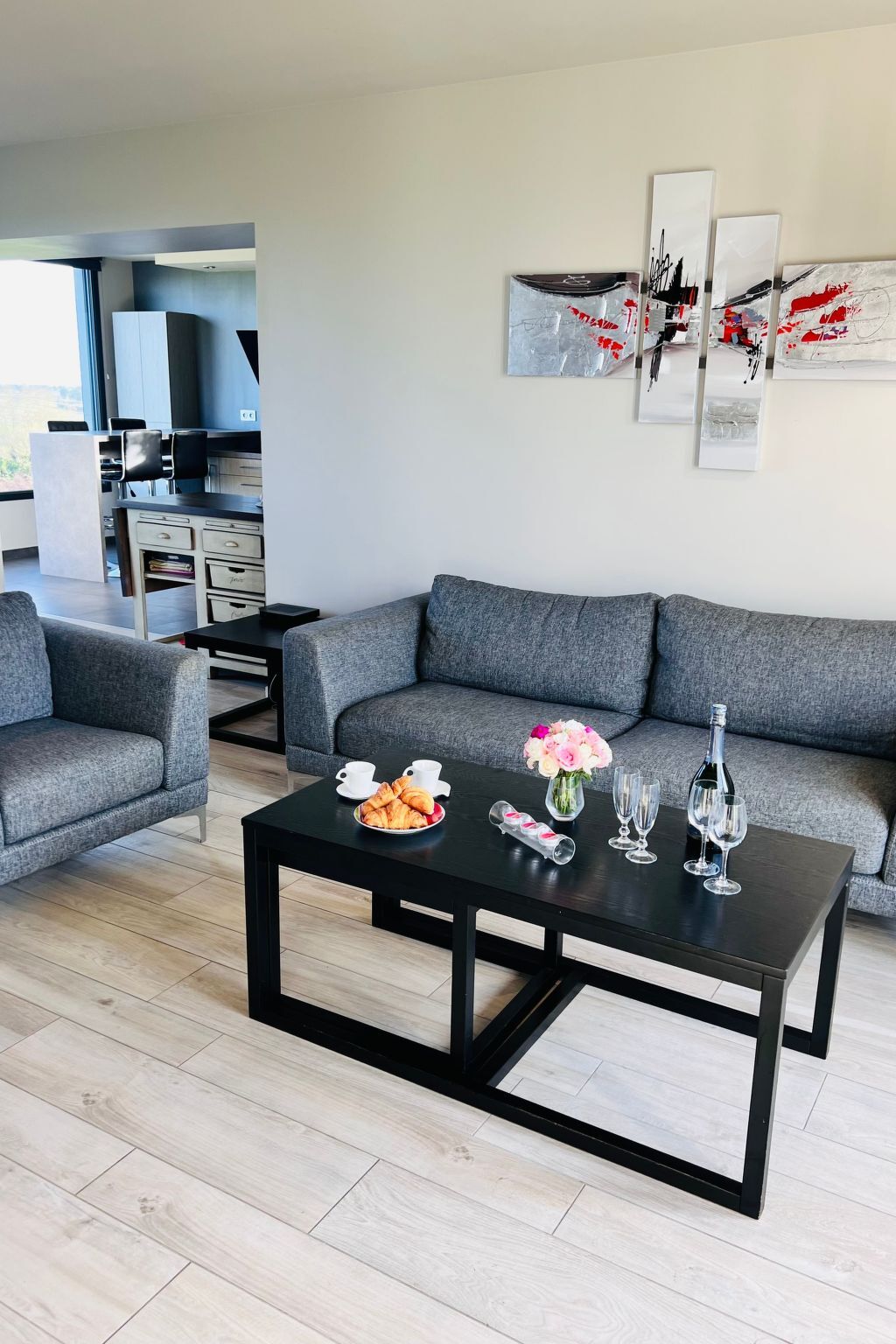 The living area is very open and spacious - a large well-equipped kitchen (of course, as already mentioned, with the great sea view) - is connected to the dining area / dining table for 6 people and the living room area with sofas.