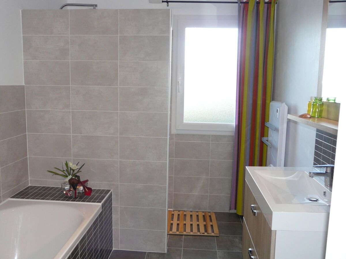 Une salle de bain équipée d'une baignoire et d'une douche à l’italienne et deux toilettes séparées ajoutent une touche de luxe, complétées par une buanderie fonctionnelle.