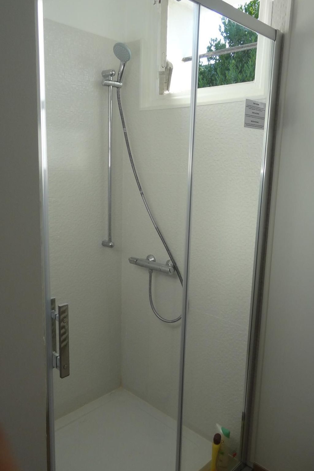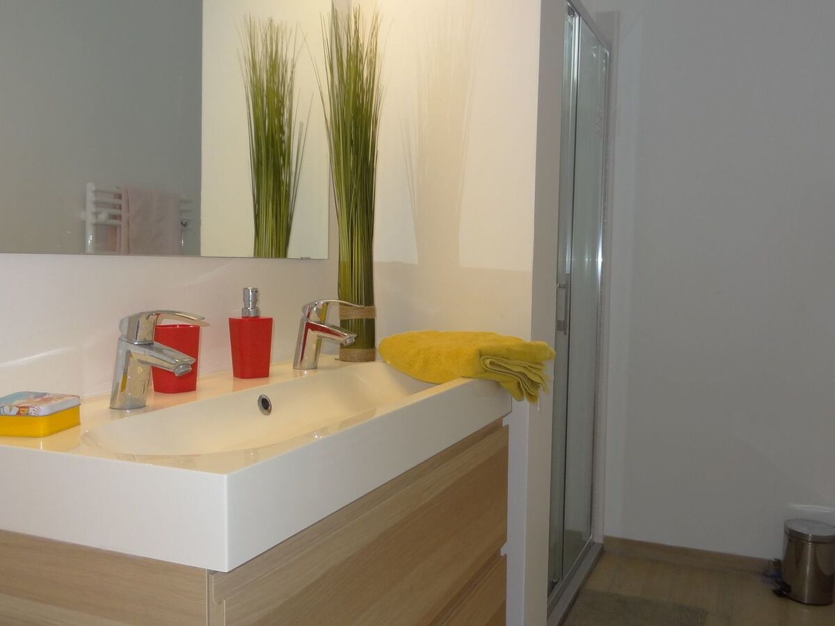 La salle de bains offre de son côté une double vasque, une large douche (110X80) éclairée naturellement, et un sèche serviette.