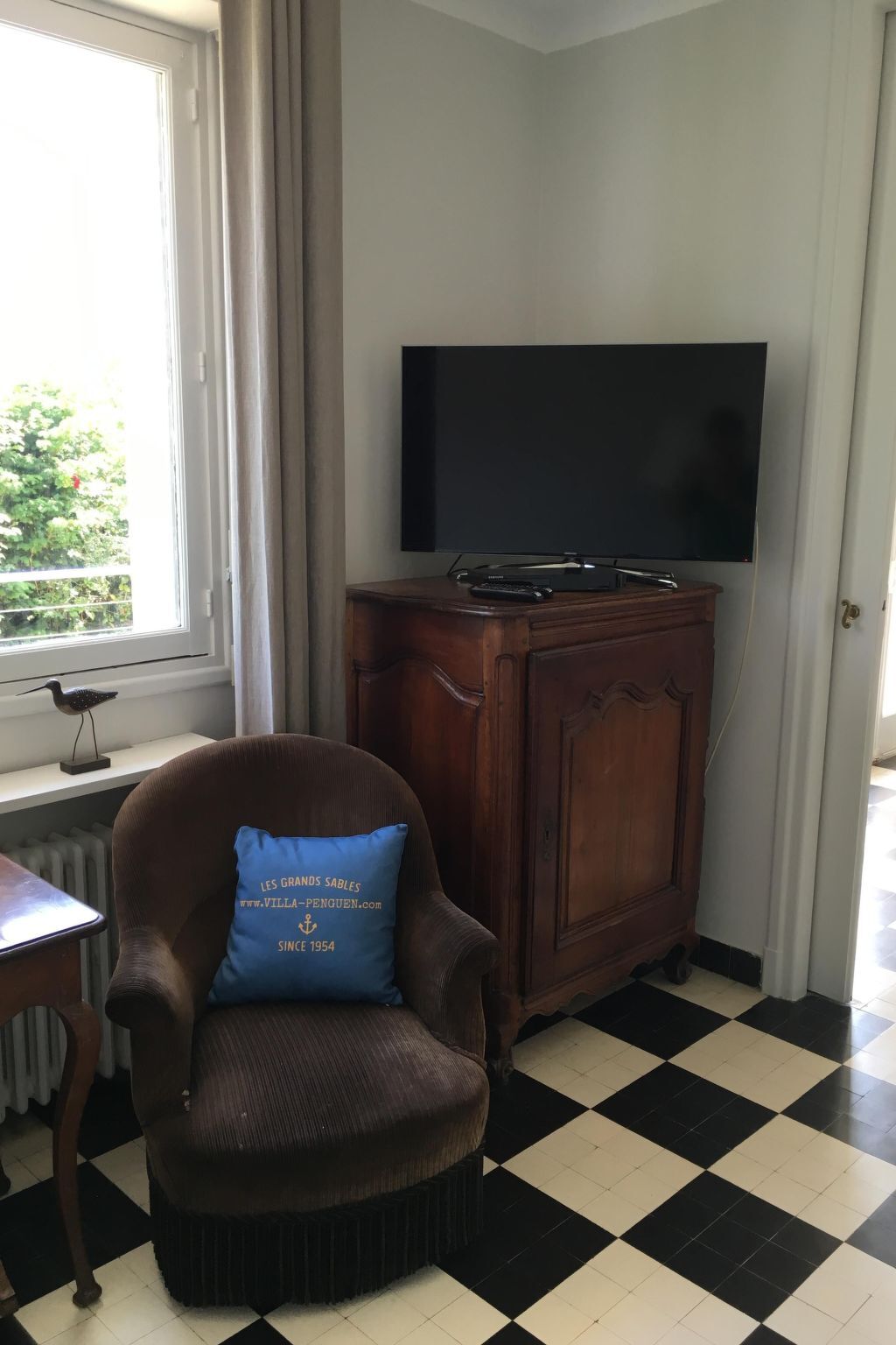 La partie salon agrémentée d’un joli canapé vous accueille avec ensemble multimedia de qualité (TV écran plat 42’ avec abonnement NETFLIX, DVD, box WIFI).