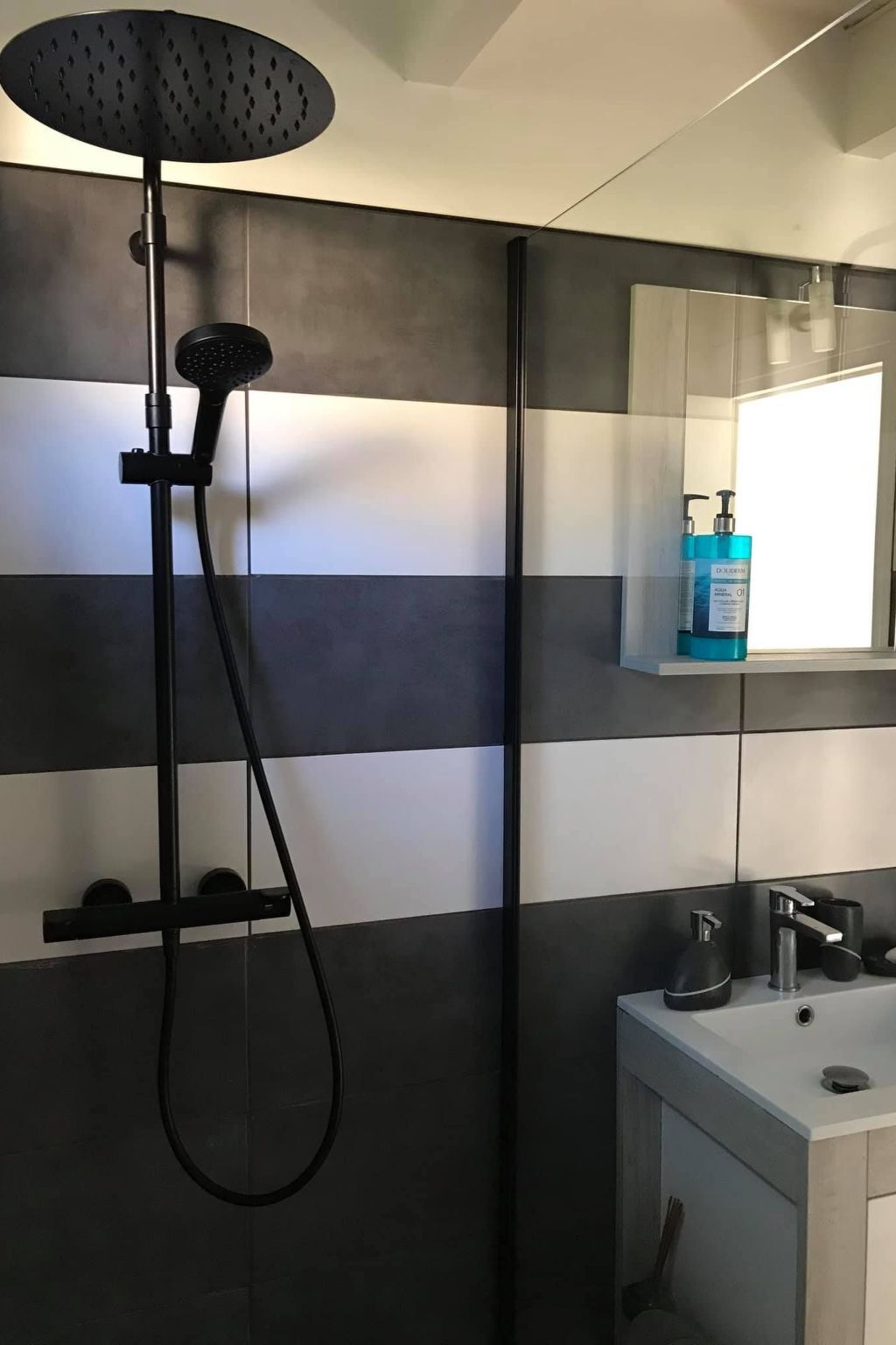 A côté de la cuisine se trouve une salle de bain avec douche et lavabo, sèche-cheveux, machine à laver.