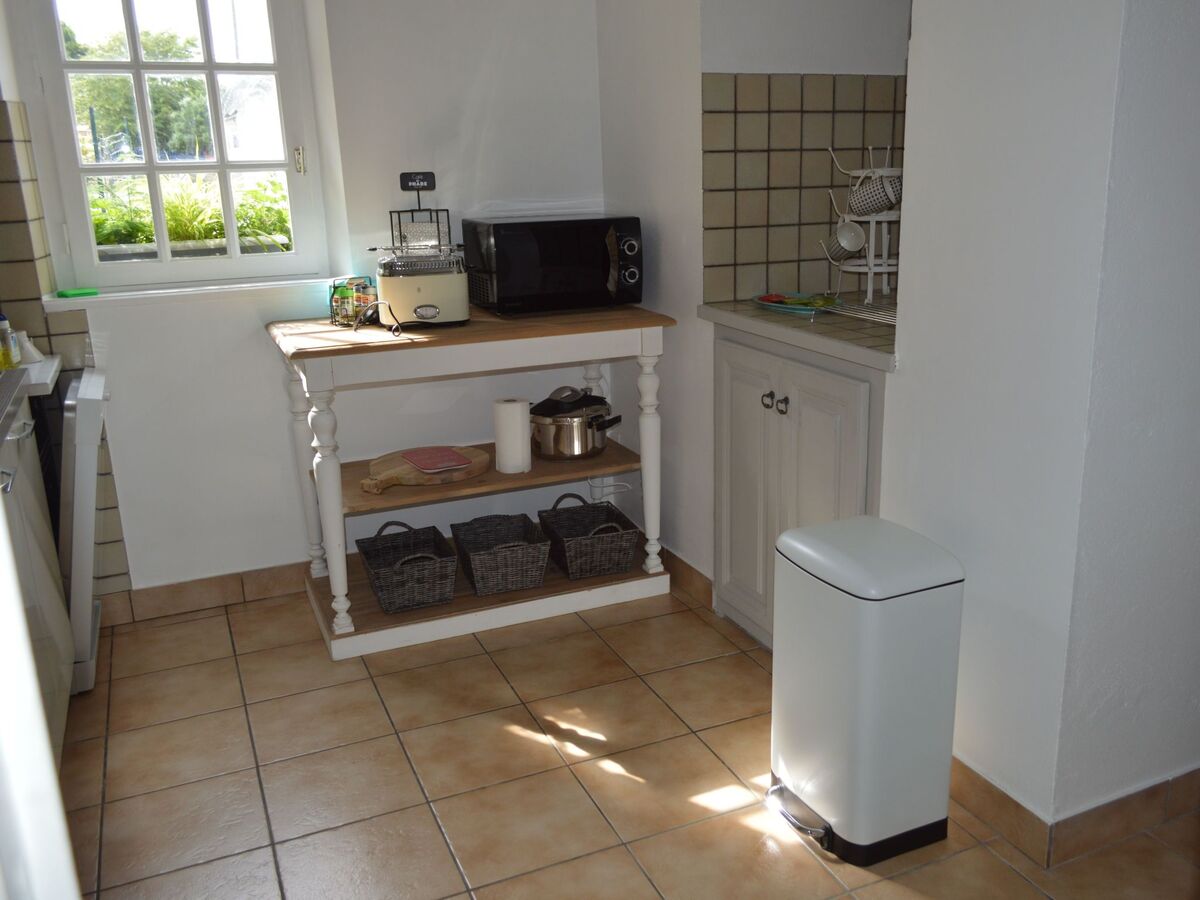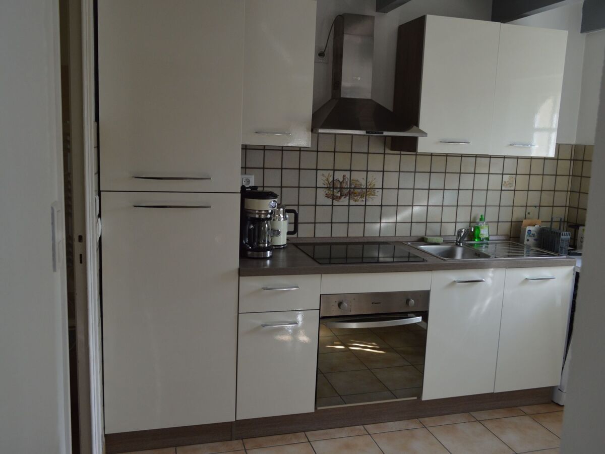 A côté du salon se trouve une cuisine encastrée et toute équipée avec plaque à induction, four, four à micro-ondes, cafetière, bouilloire, théière, grille-pain, lave-vaisselle et coin repas.