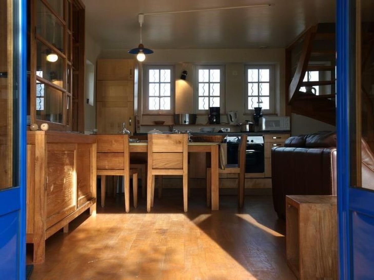 Le salon est meublé avec un confortable coin salon en cuir devant la cheminée ainsi qu’ une cuisine intégrée entièrement équipée et dotée d’un coin repas.