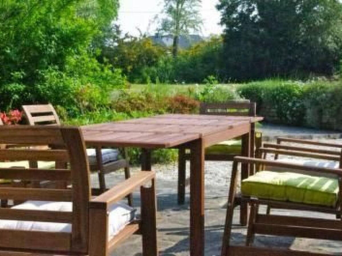 La terrasse est équipée d'un salon de jardin avec parasol et 2 transats.