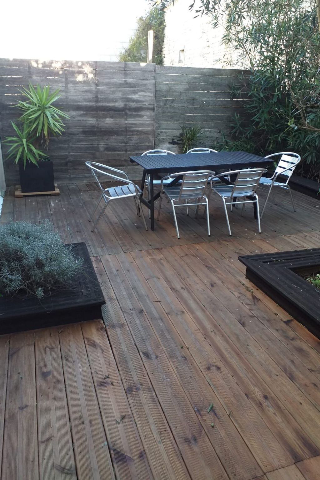 Grande terrasse en bois de 30 m2 et jardinet avec 2 salons de jardin et fontaine