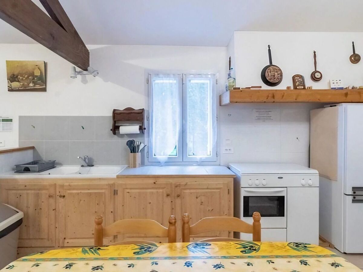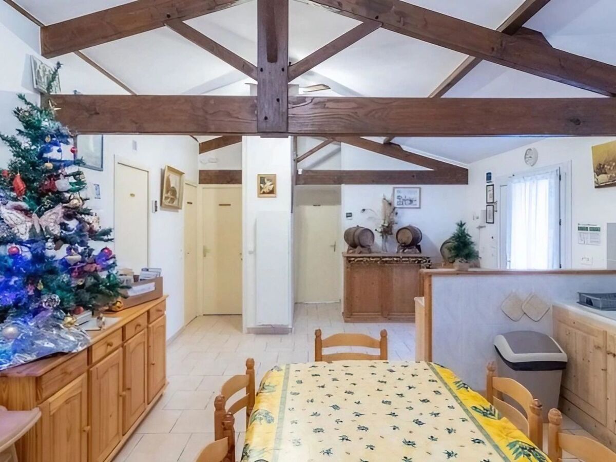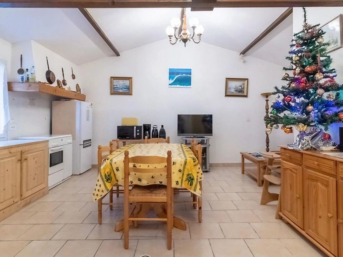 La cuisine tout équipée ouverte sur le séjour dispose d'un canapé-lit, d'un bar, d'une large télévision, et de tout le nécessaire pour préparer de délicieux repas, faisant de cet espace un lieu de vie agréable et pratique.