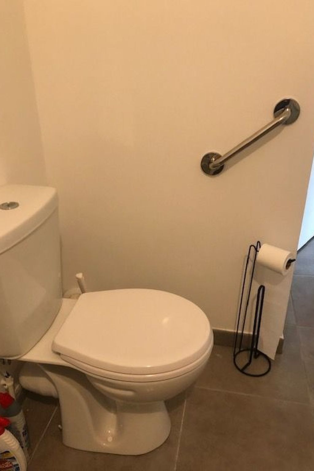 Le rez-de-chaussée, d'une superficie de 48 m², comprend une entrée avec cellier, une salle d'eau avec WC adapté aux personnes à mobilité réduite, ainsi qu'une cuisine entièrement équipée ouverte sur une salle à manger spacieuse et un grand salon doté d'une télé et d'une box SFR.